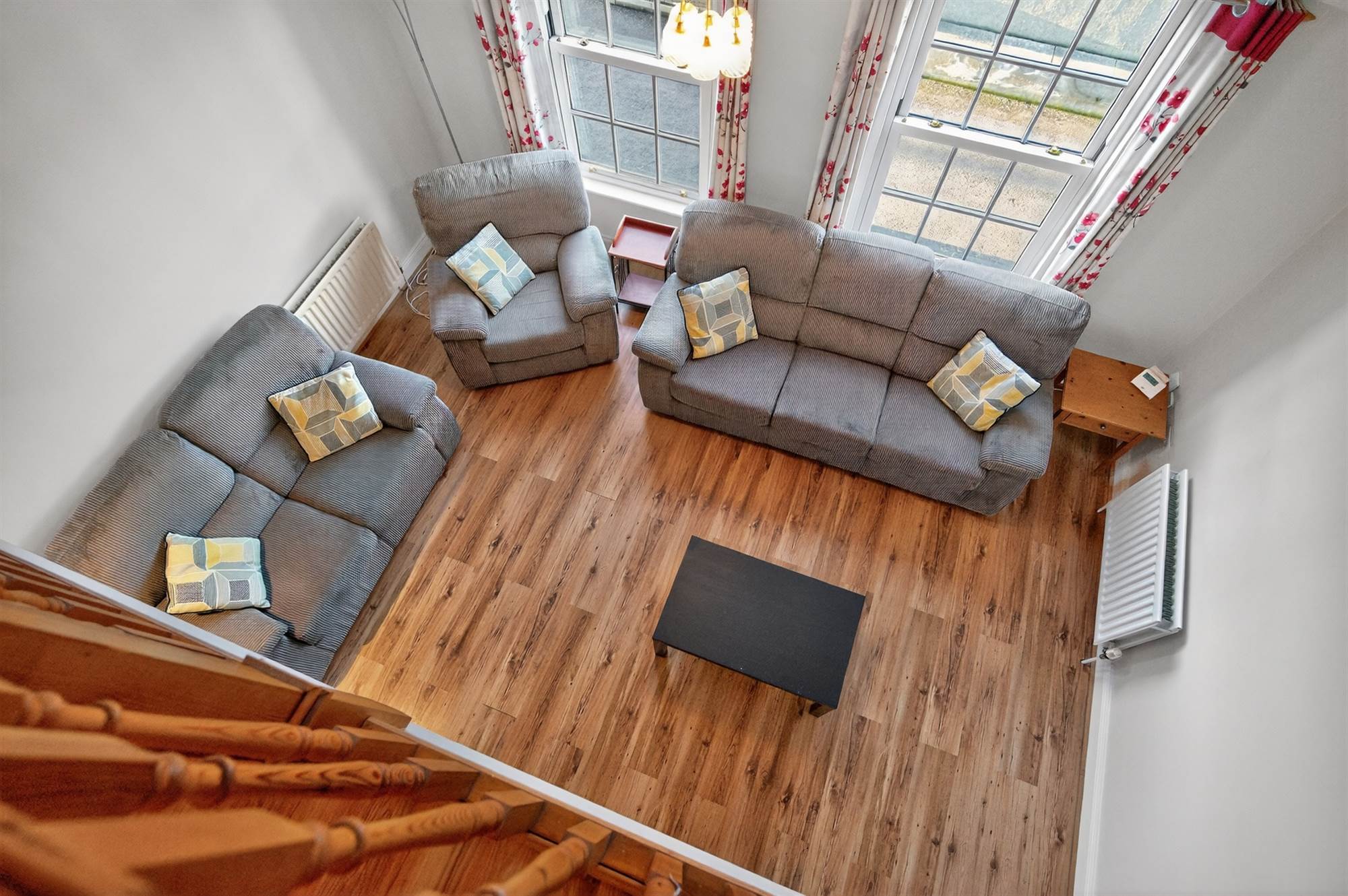 Fitted kitchen with range of high and low level units, four ring gas hob, stainless steel extractor hood, stainless steel sink unit with drainer, integrated fridge freezer, electric oven, tiled splashback, ceramic tiled floor. Open plan to double height vaulted dining/living area with laminate wood effect floor. Stairs to . . .