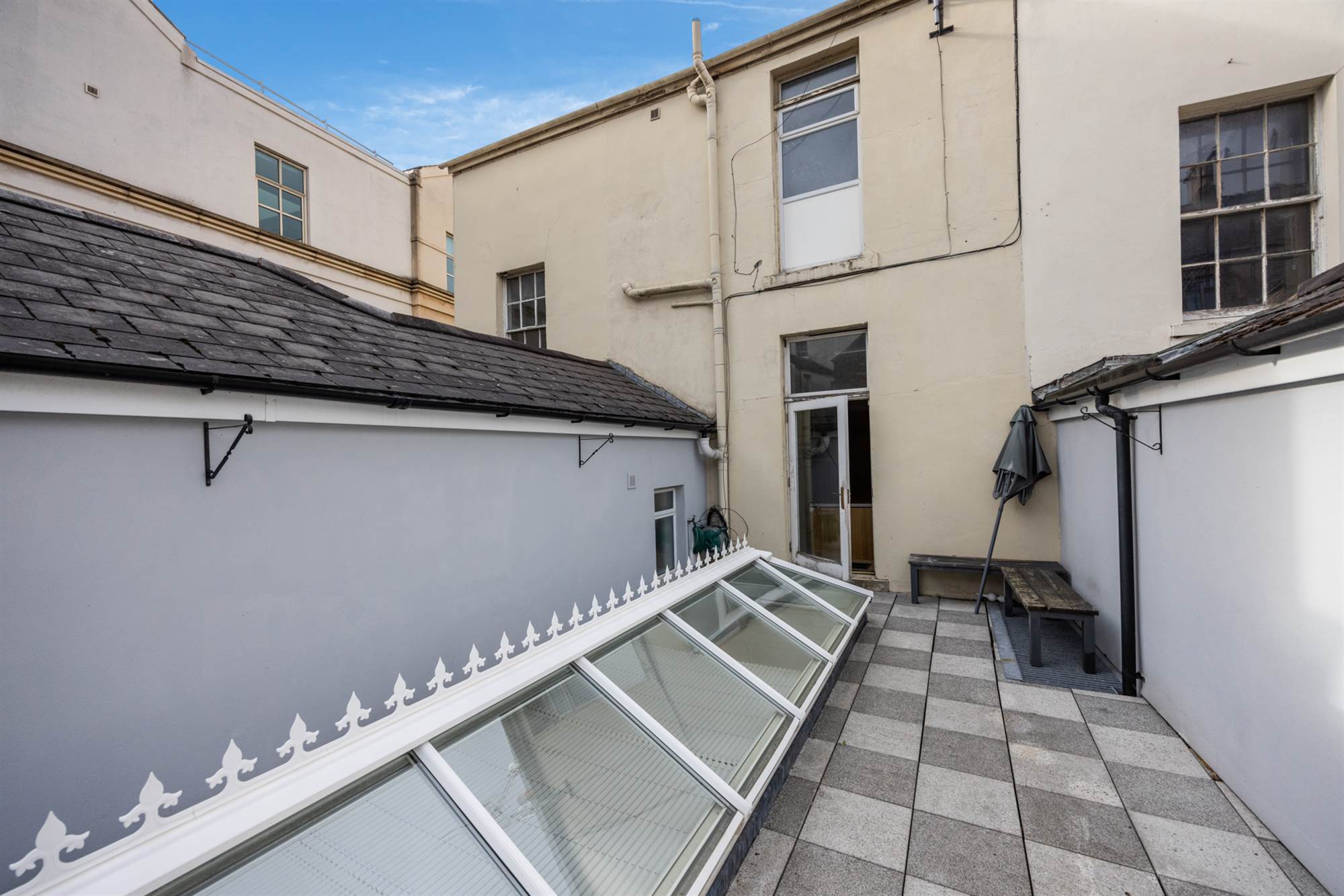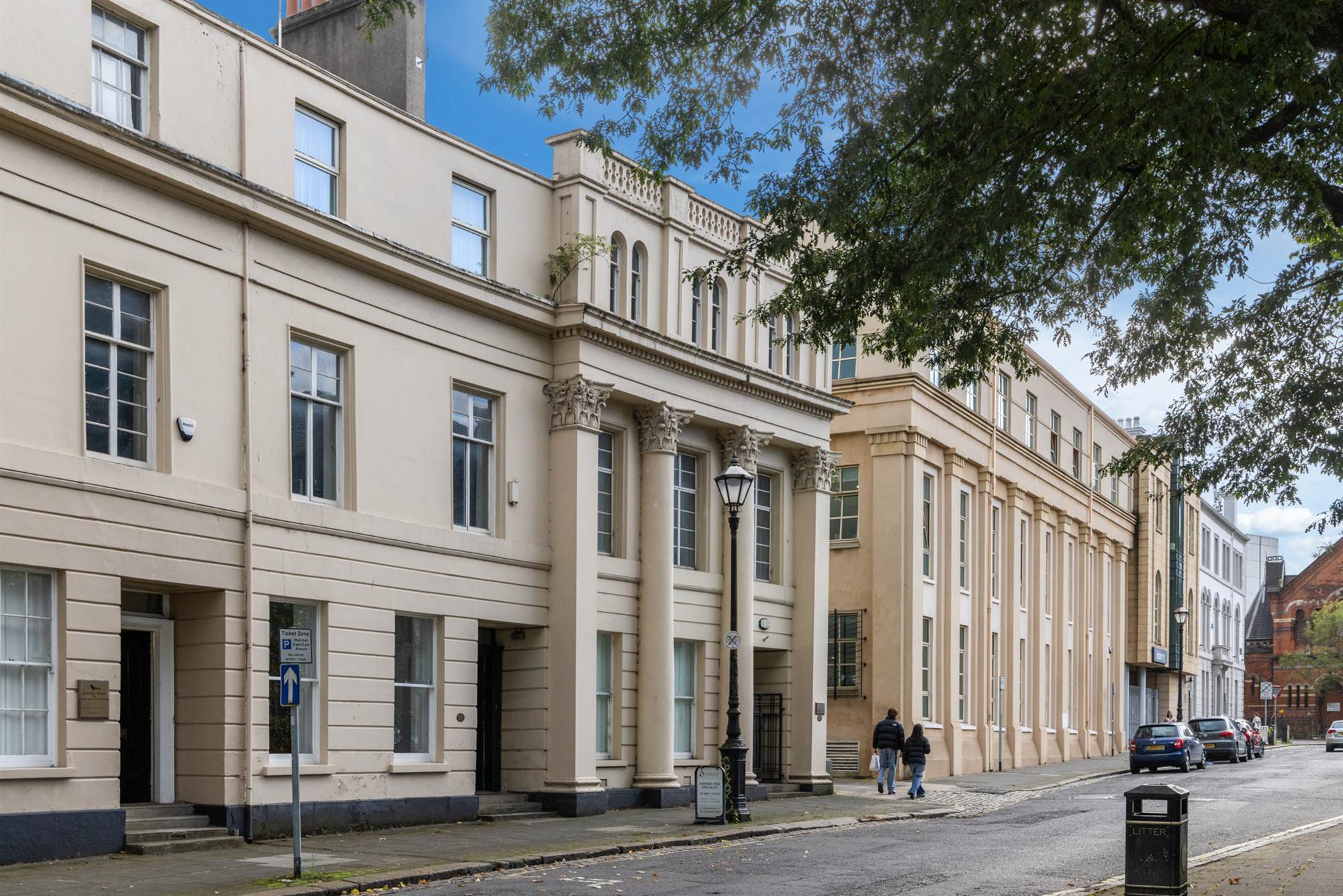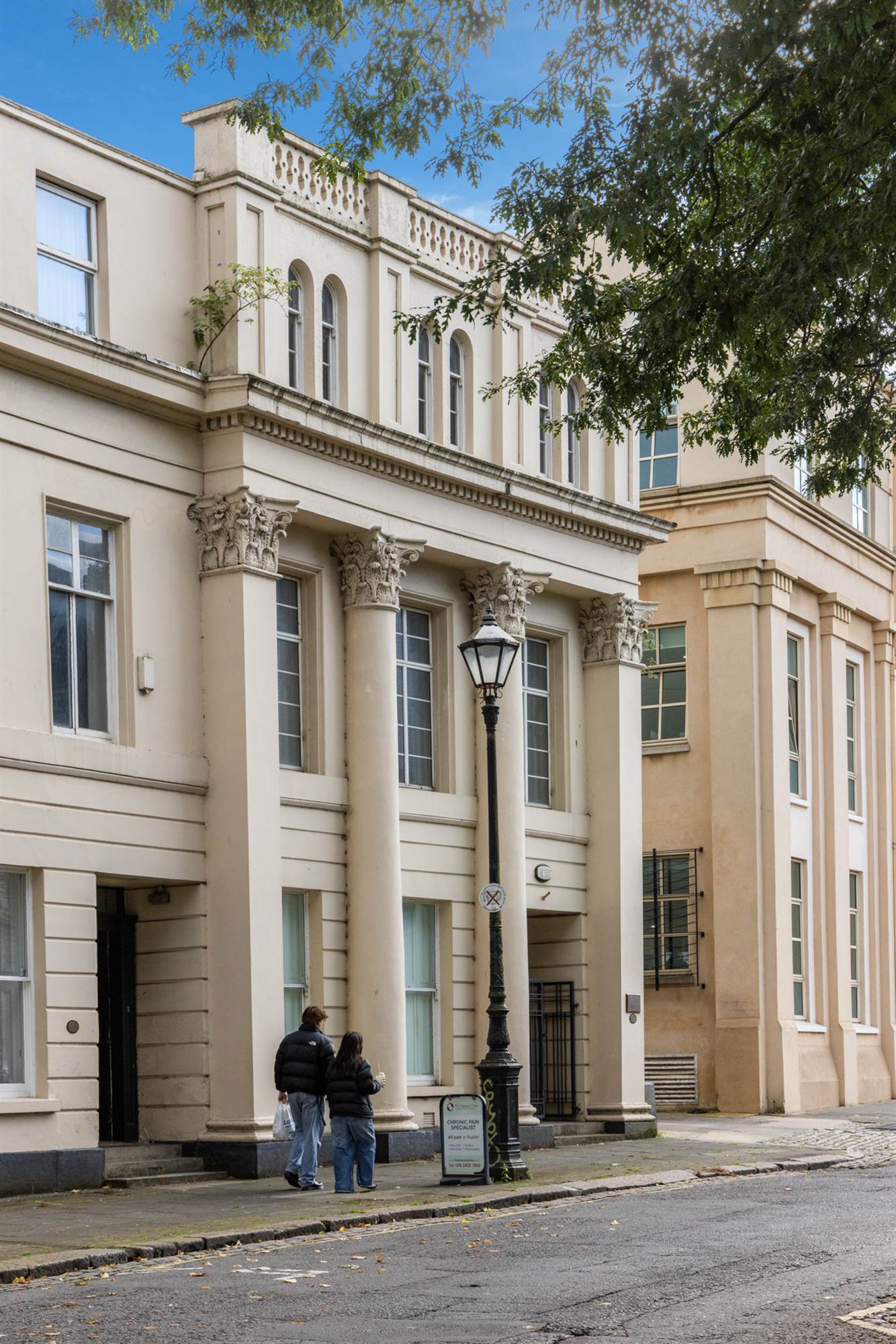 No.7 is set to the west end of the row and is one of the more ornate buildings of the grouping, having large two storey Corinthian columns to front. The front elevation is asymmetrical and faces roughly North. To the right on the ground floor is the entrance, which consists of a recessed timber panelled door with panelled pilaster jambs and rectangular two pane fanlight. Two stone steps to door. To the left of the doorway are two tall plain sash windows. To the first floor are three larger windows set on a sill course. These have recent frames made to resemble the original regency style sashes. To the second floor are three pairs of narrow, semicircular headed sash windows. These windows rest on a more pronounced (cornice-like) sill course projection with dentillations.