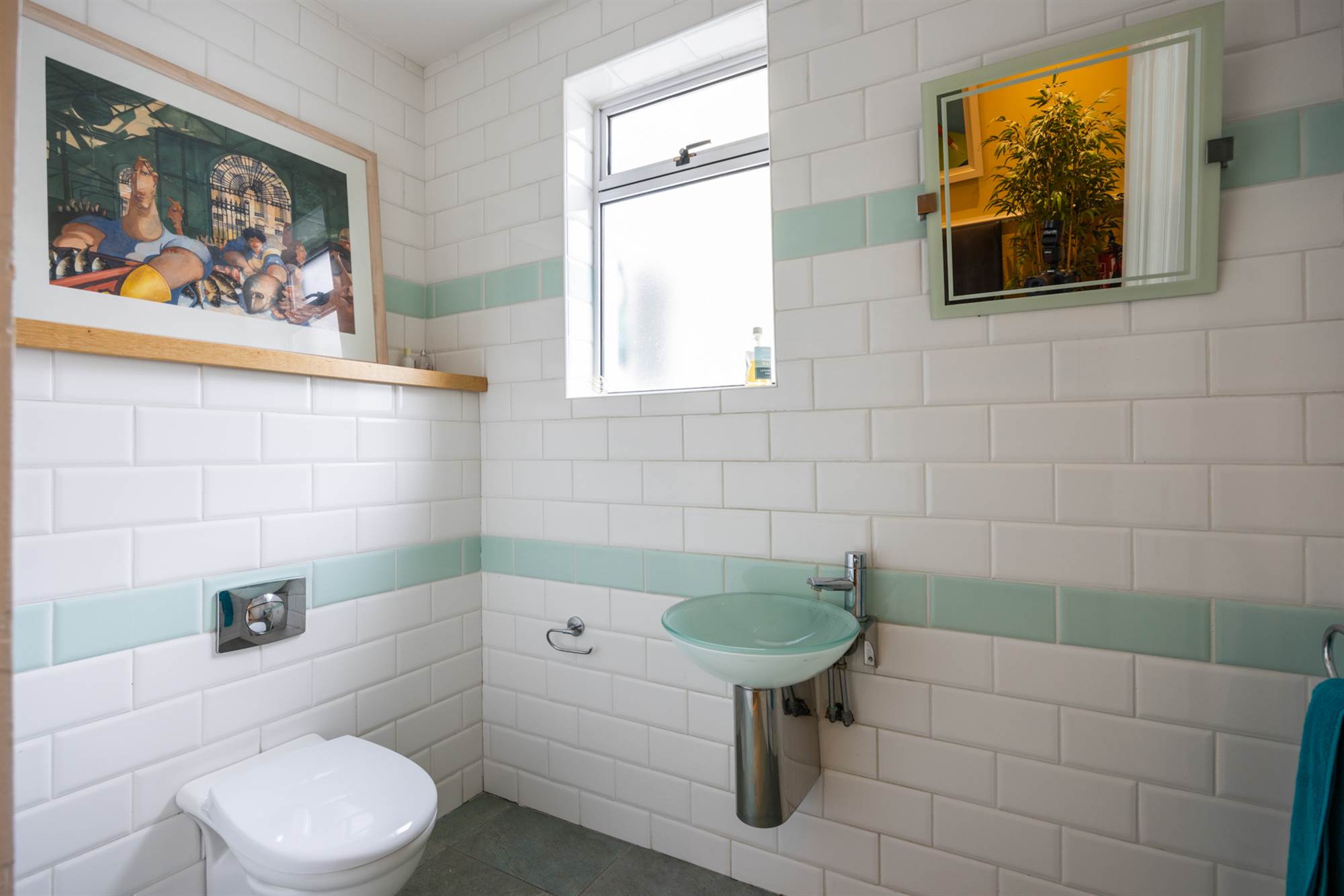 Low flush WC, vanity sink unit, ceramic tiled floor, fully tiled walls, chrome towel radiator.