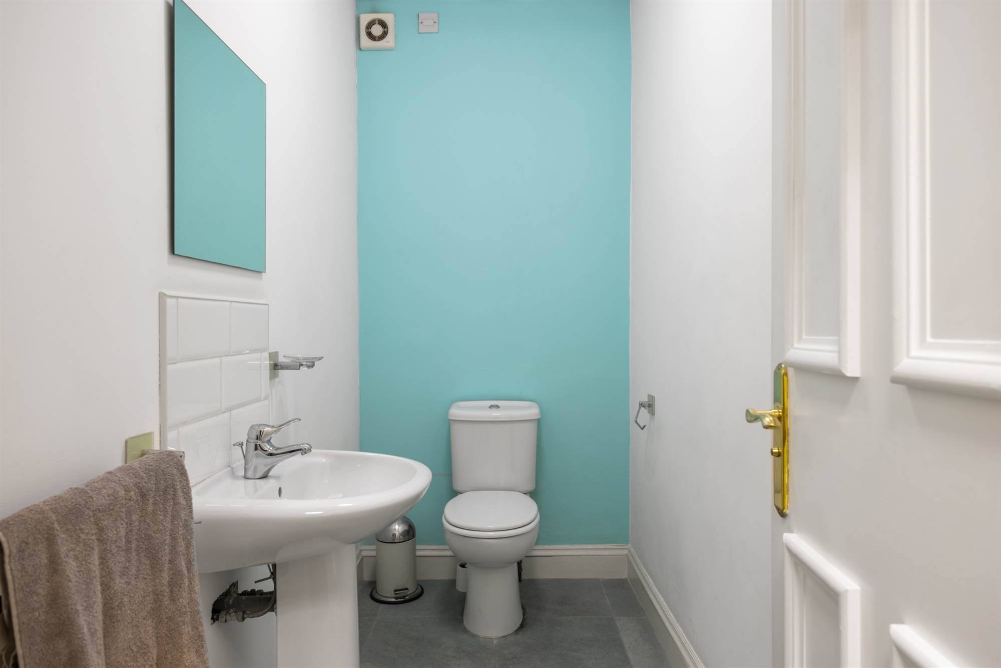 Pedestal wash hand basin, low flush WC, ceramic tiled floor.