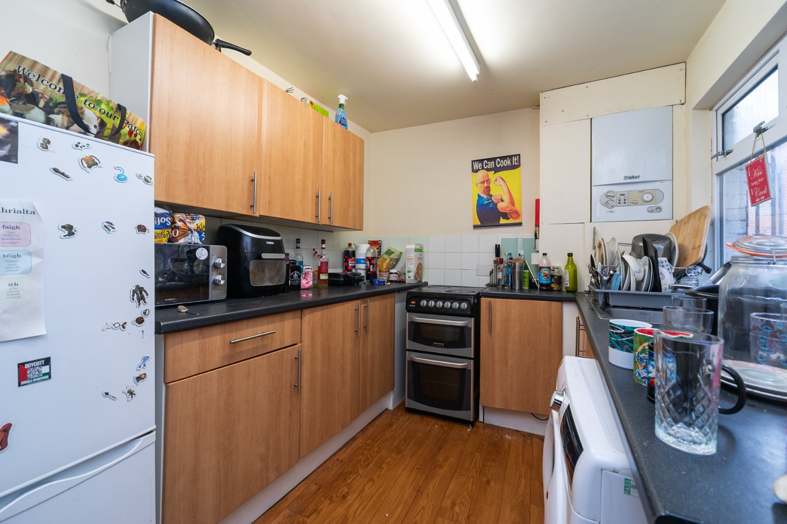 Range of high and low level units, space for fridge and cooker, plumbed for washing machine, stainless steel sink unit, Vaillant gas boiler