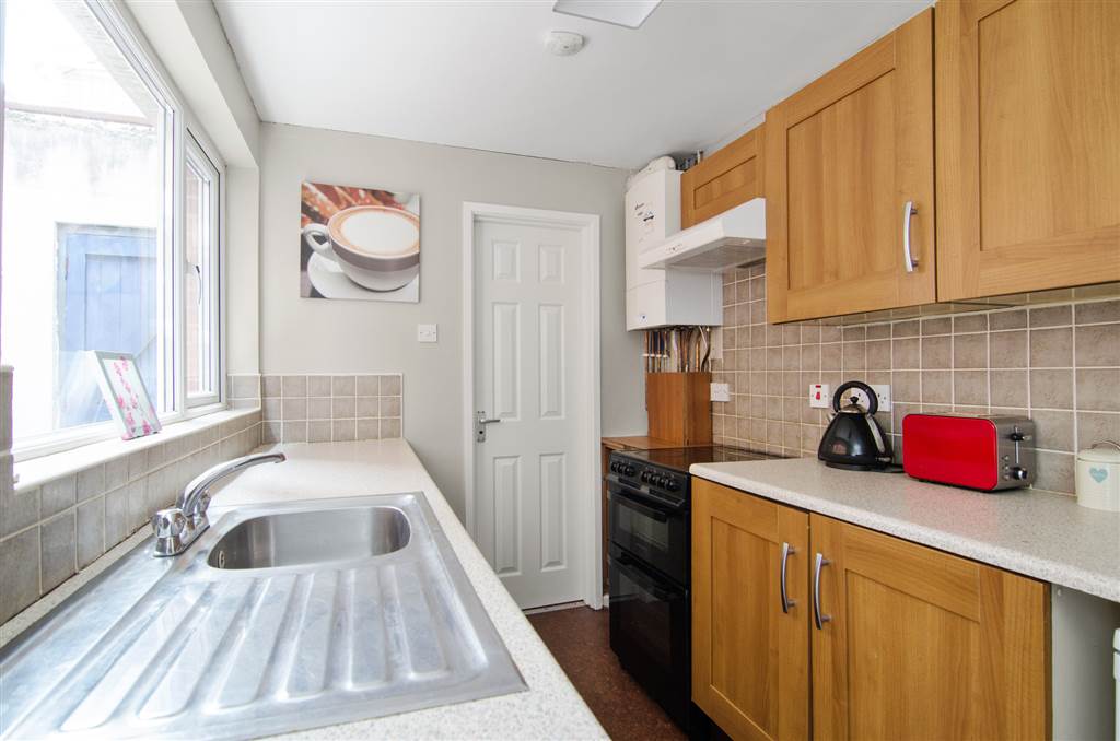 Range of high and low level units, work surfaces, single drainer stainless steel sink unit with mixer tap, space for cooker, extractor fan, gas fired boiler, plumbed for washing machine, part tiled walls, access to rear, rear store room (formerly a shower room)