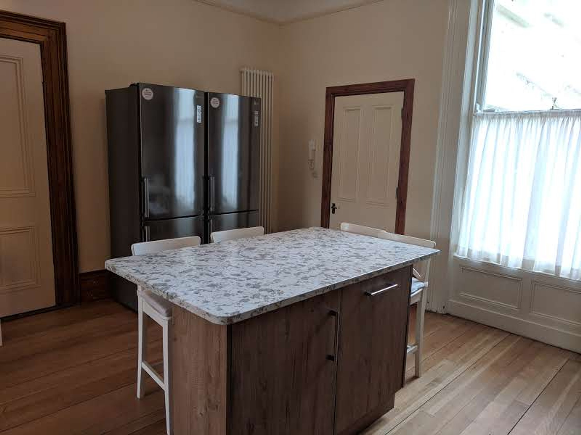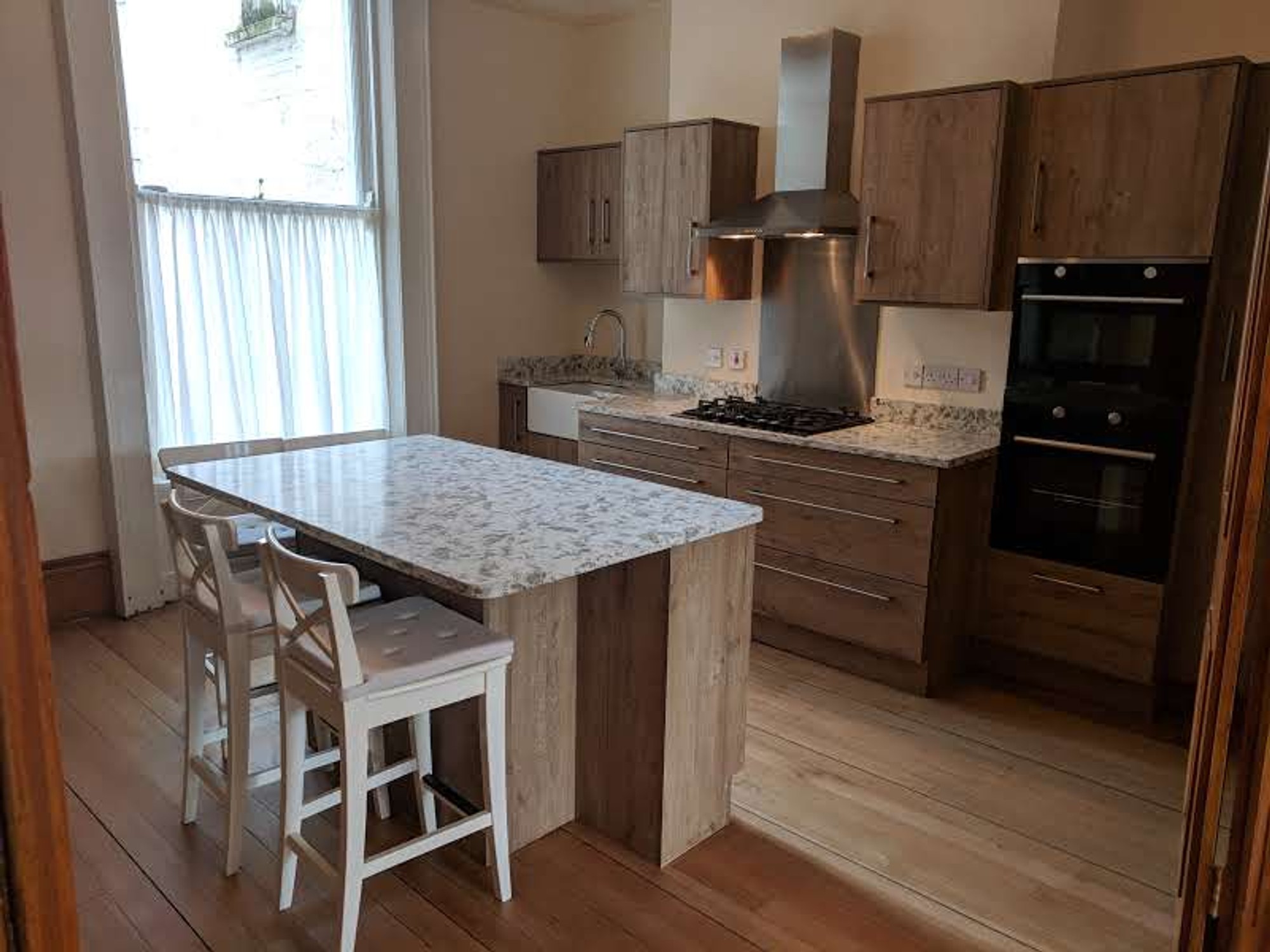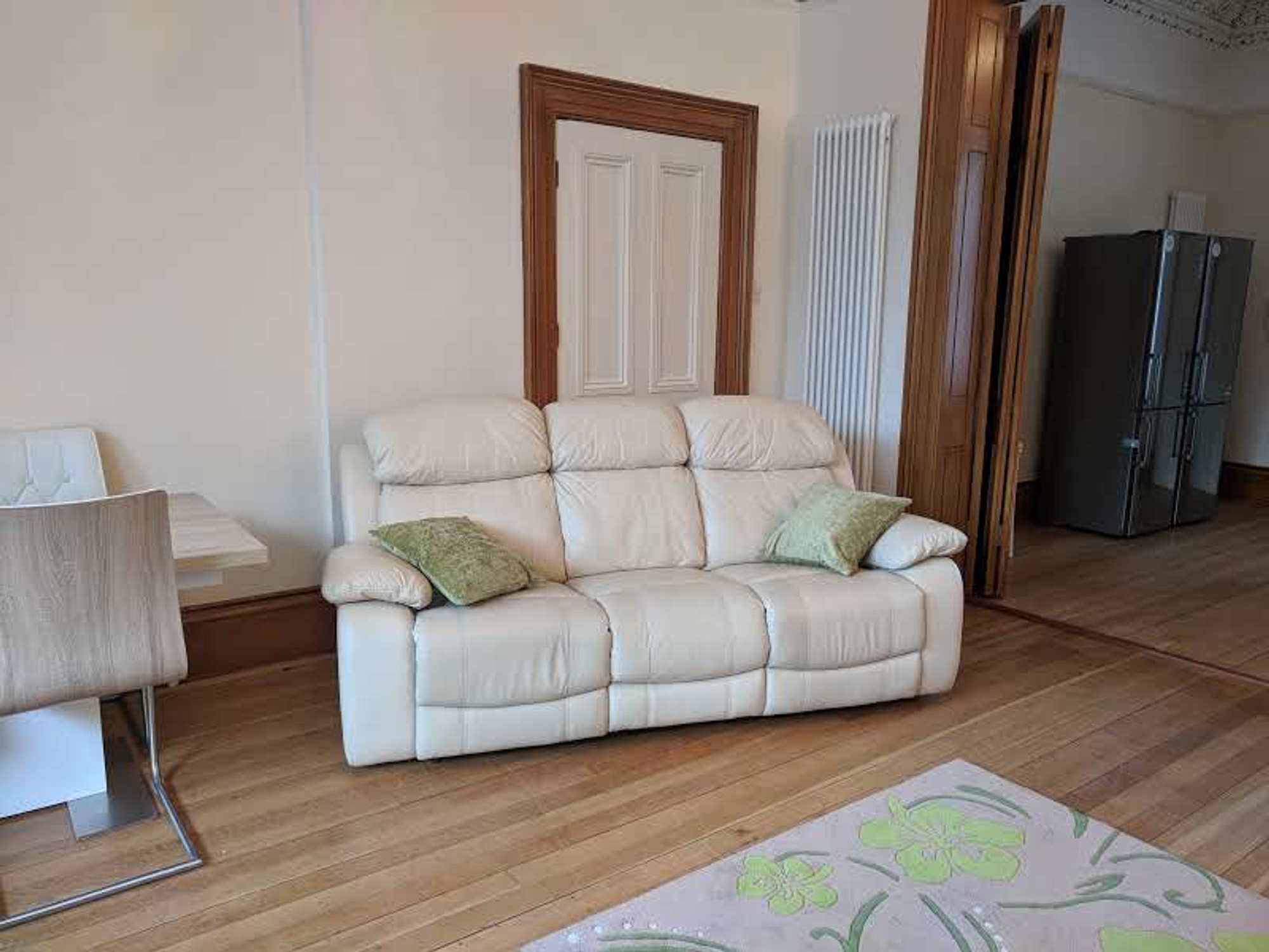 Step inside and you’ll immediately appreciate the spacious, open-plan living, dining and kitchen area, complete with elegant ceiling detailing that adds a touch of character and charm. The kitchen comes fully equipped with two large fridge/freezers, dishwasher, oven, microwave oven, gas hob, Belfast sink and washing machine, everything you need for modern city living.