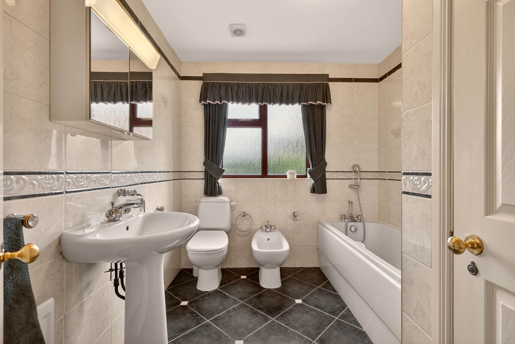 Ivory Sottini suite comprising low flush wc, bidet, pedestal wash hand basin, panelled bath with telephone hand shower, hotpress, fully tiled walls, ceramic tiled floor, extractor fan.