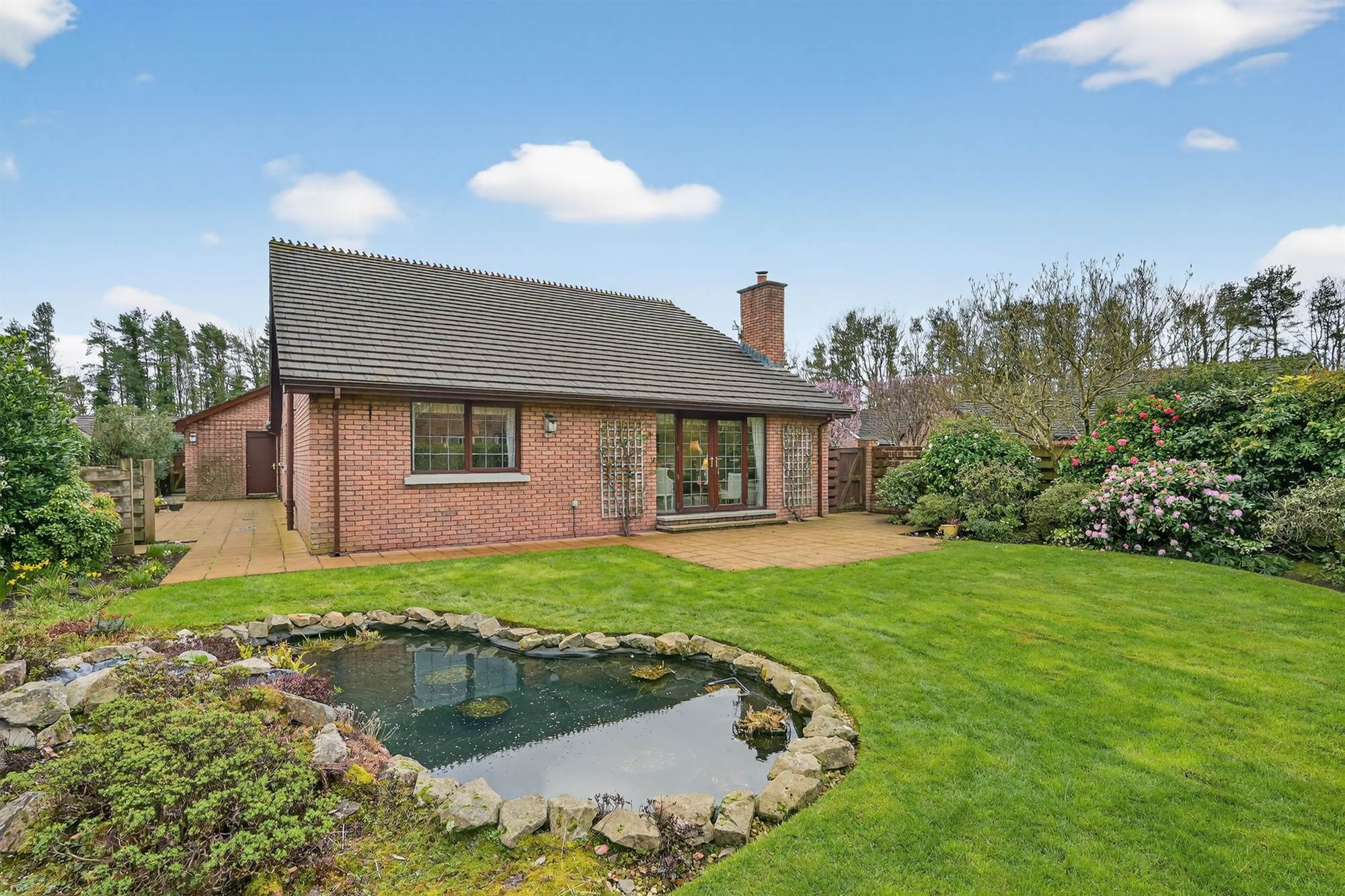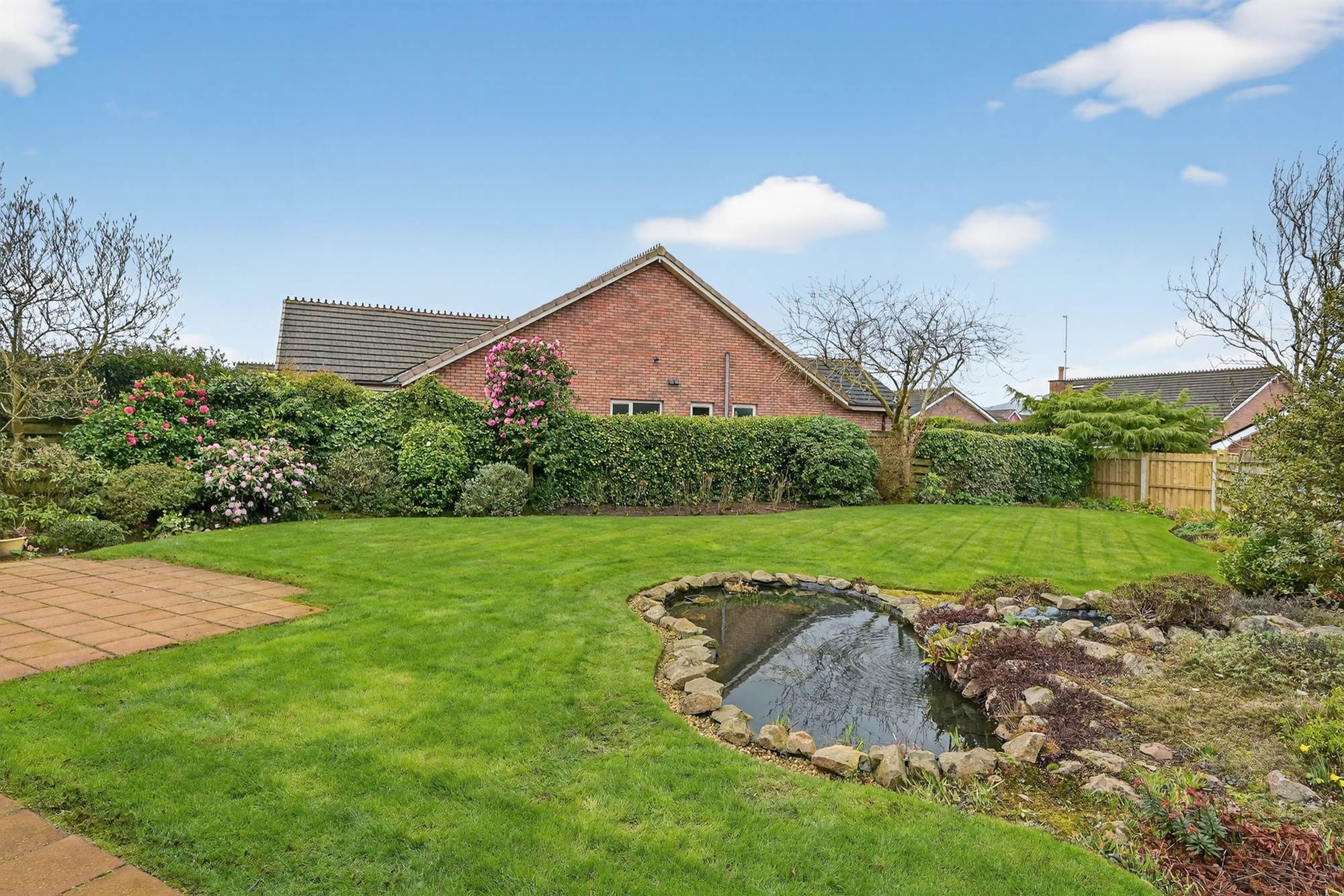 Good sized rear gardens in lawn with well-stocked beds in shrubs, bushes and trees, pond. Side paved patio area and bin area.