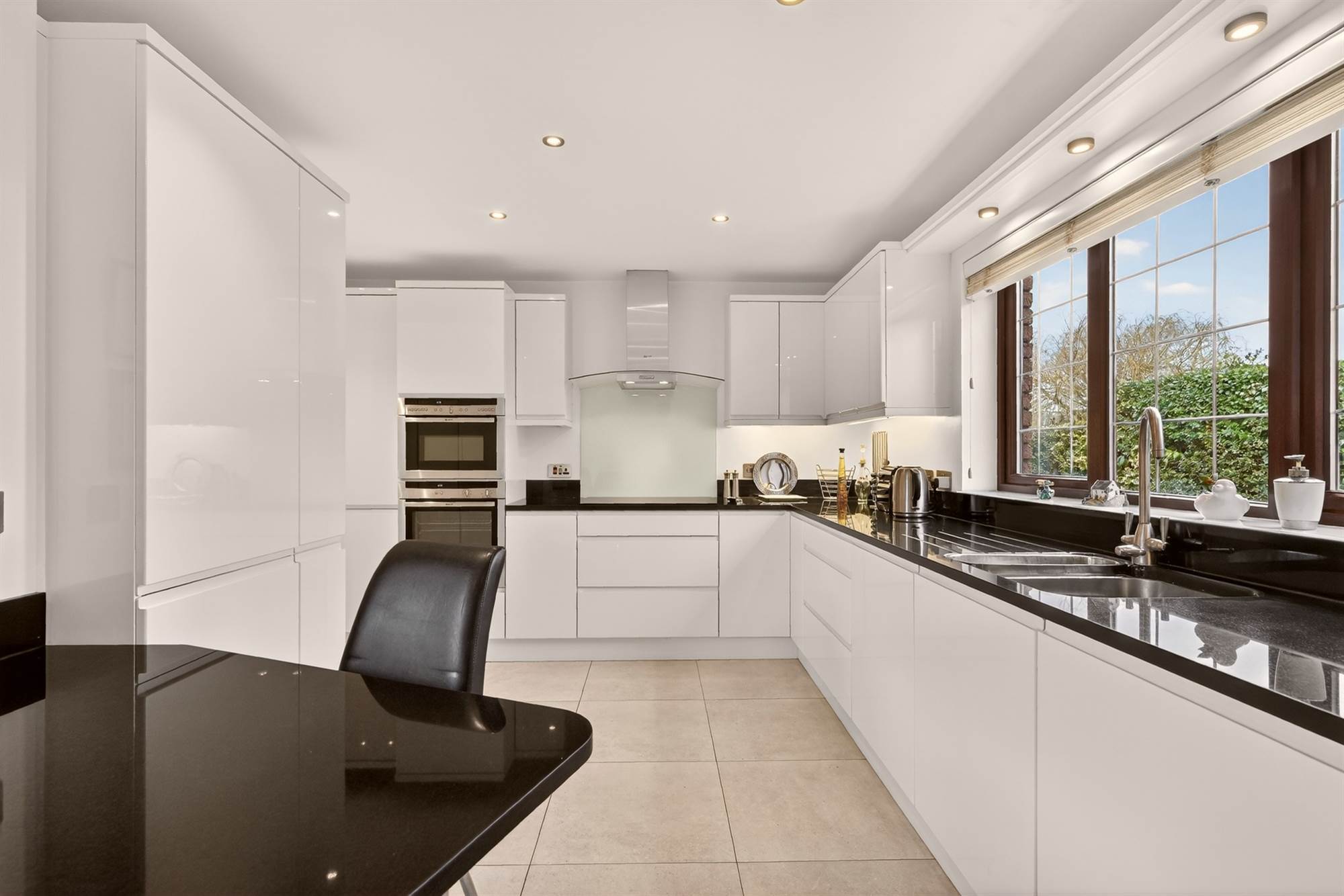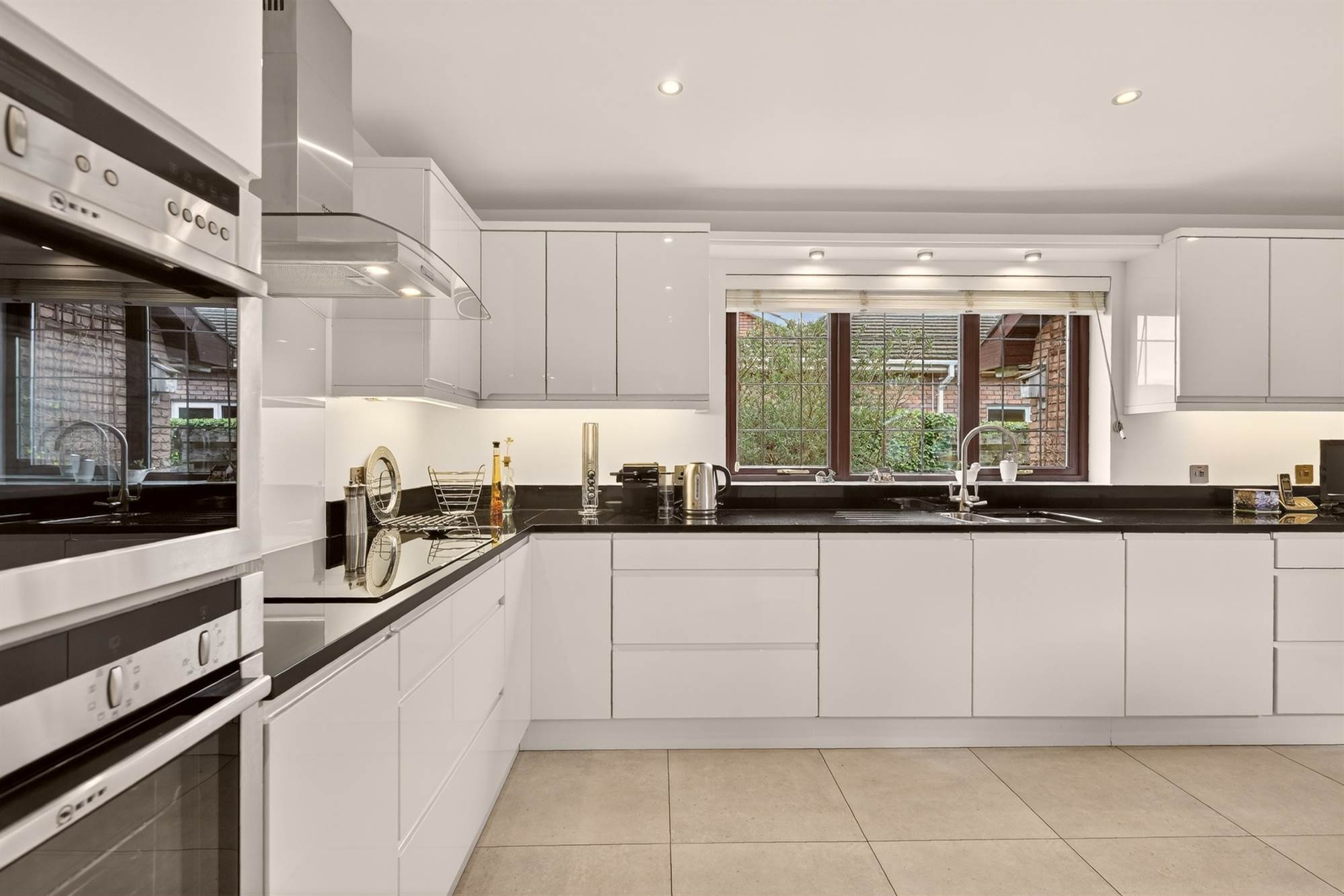 (at widest points). High gloss range of high and low level units, granite work surface with drainer, one and a half bowl stainless steel sink unit, integrated Neff double ovens, Neff hob, Neff stainless steel extractor fan, integrated Bosch dishwasher, integrated washer/dryer, ceramic tiled floor, low voltage spotlights. Integrated fridge/freezer, integrated freezer, breakfast bar.