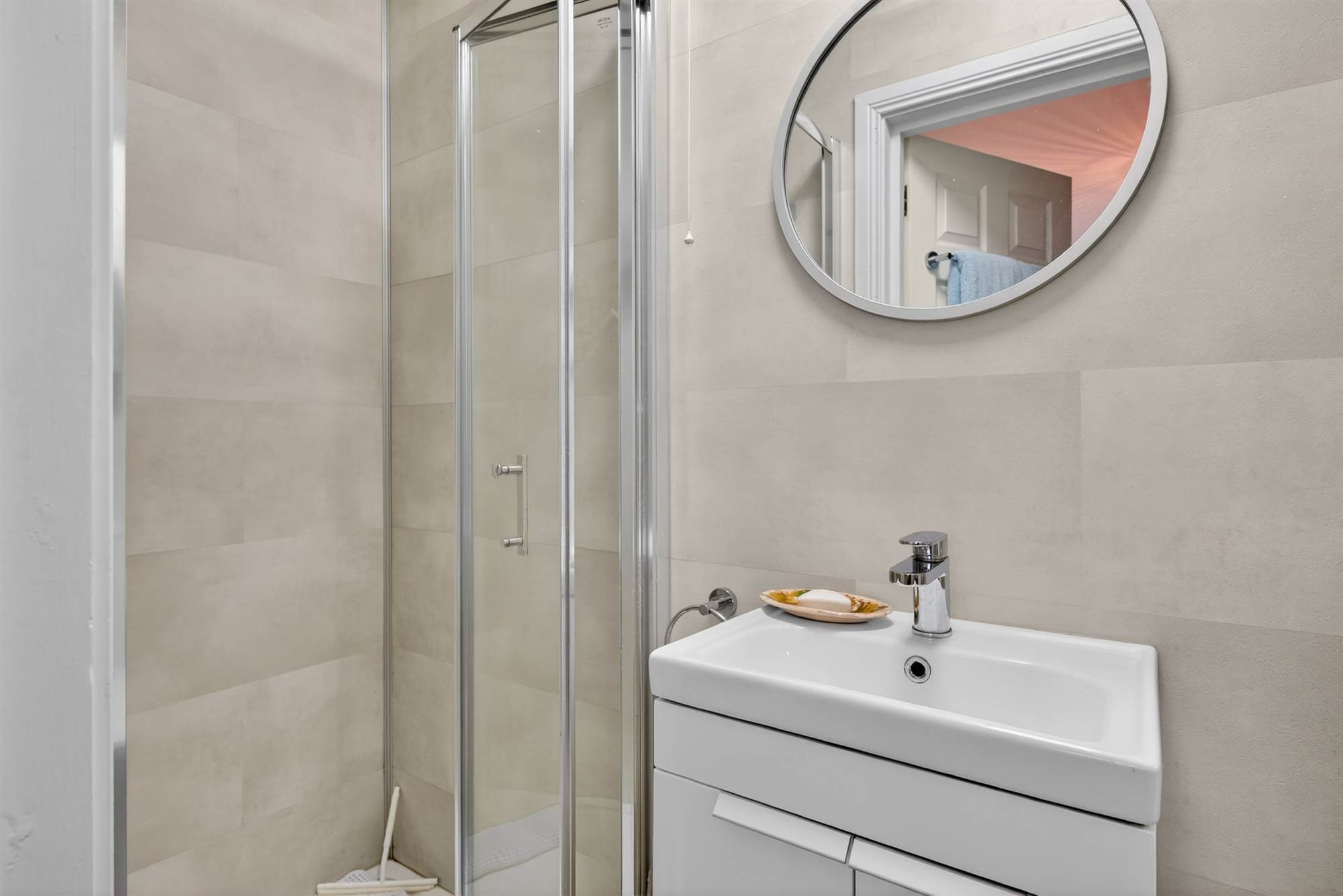 White suite comprising low flush WC, vanity unit with wash hand basin, fully tiled shower cubicle, fully tiled walls, wood effect floor, extractor fan.
