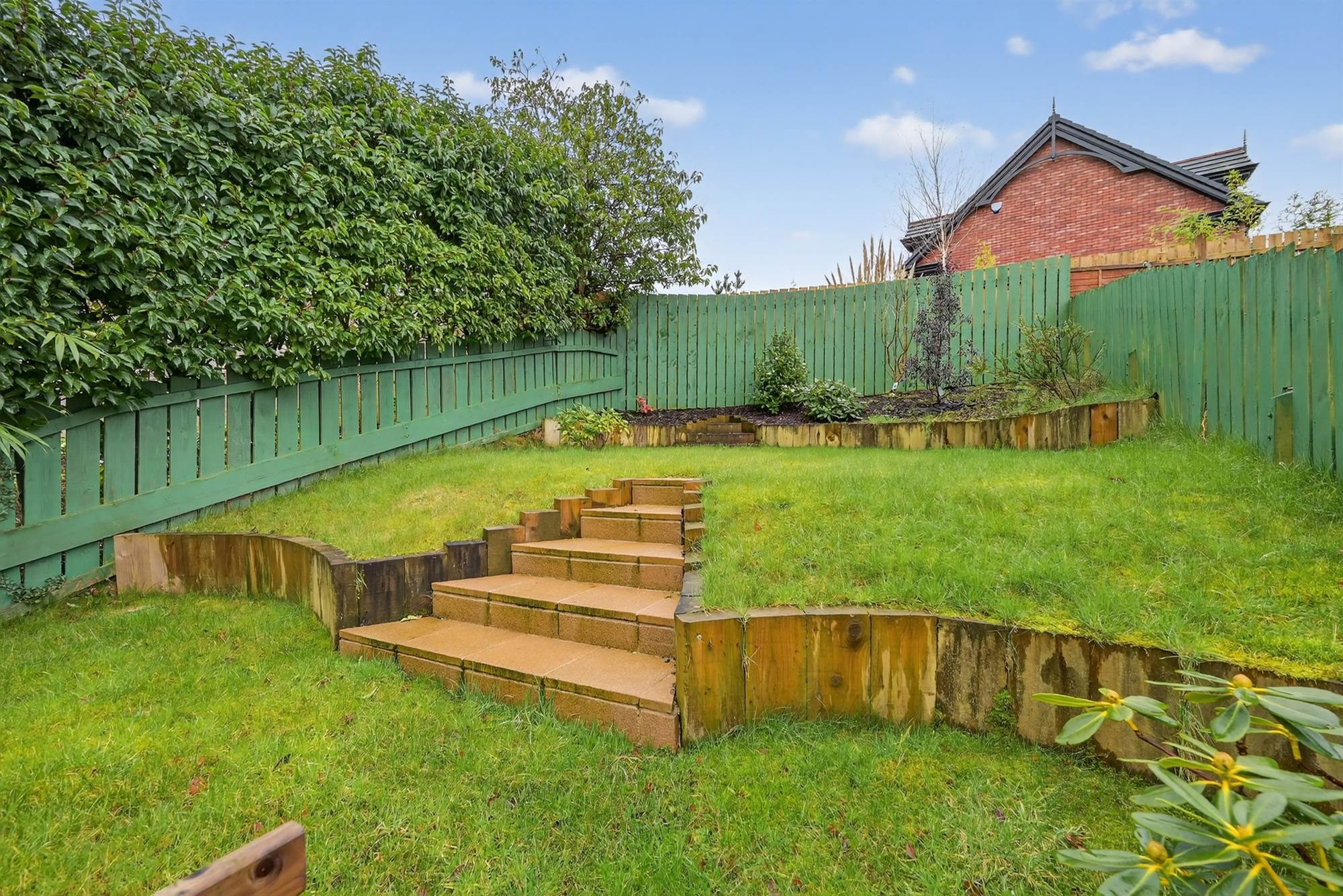Enclosed rear gardens with paved patio area, steps to tiered lawns and beds in shrubs, trees and bushes, wooden fencing.