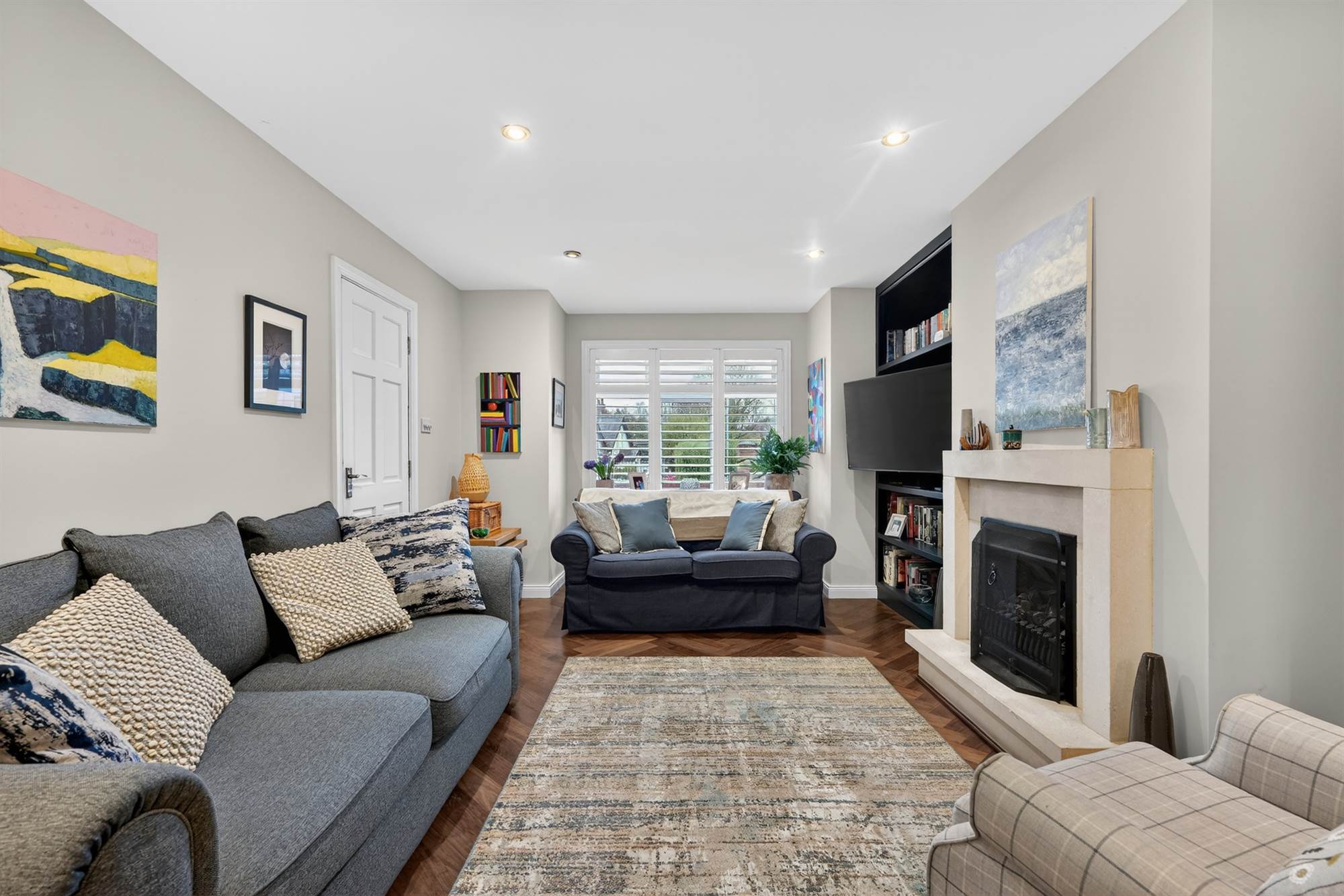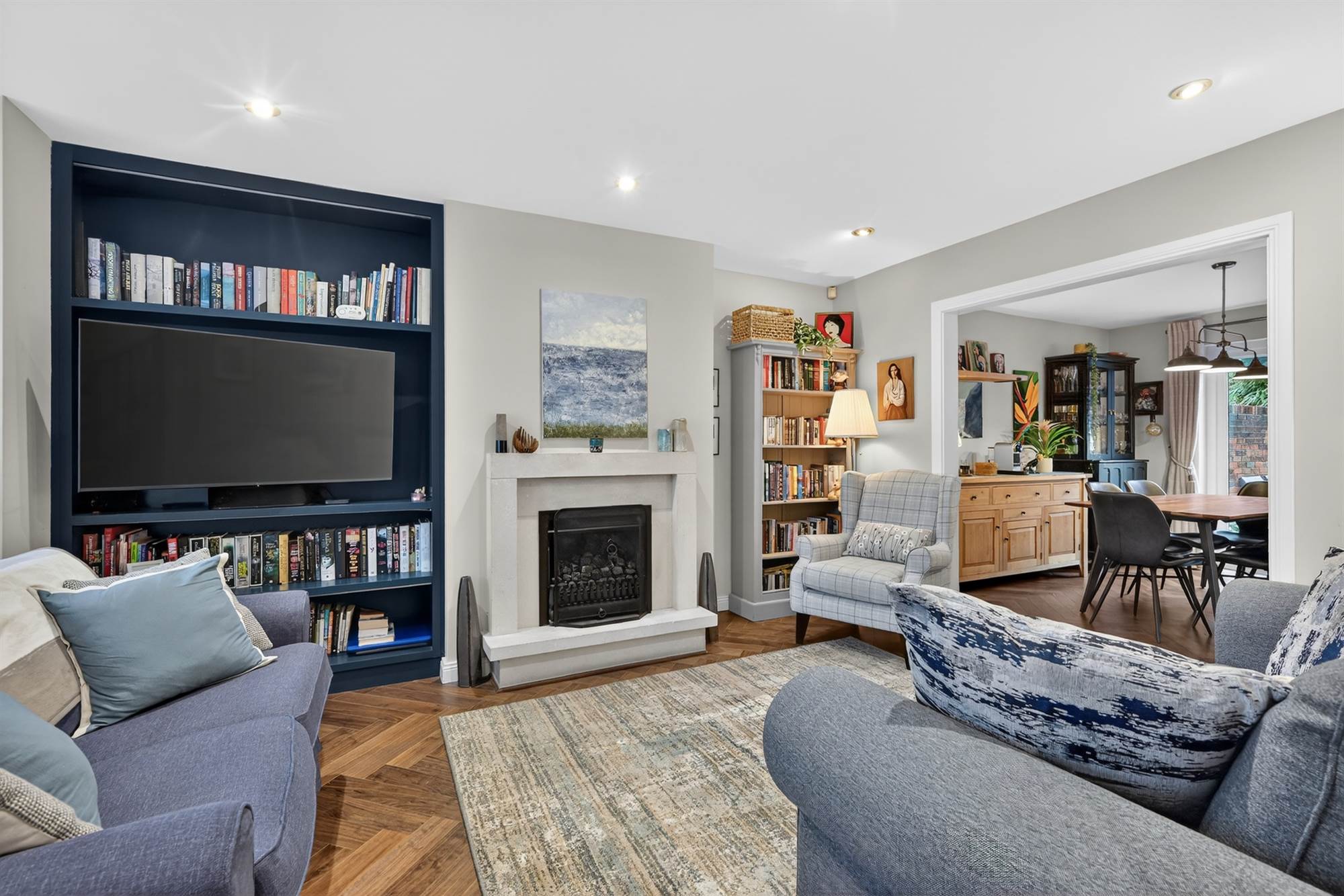 Stone surround fireplace with gas coal electric fire, herringbone wood effect floor, low voltage spotlights, window shutters, built in tv unit with shelving, open plan to...