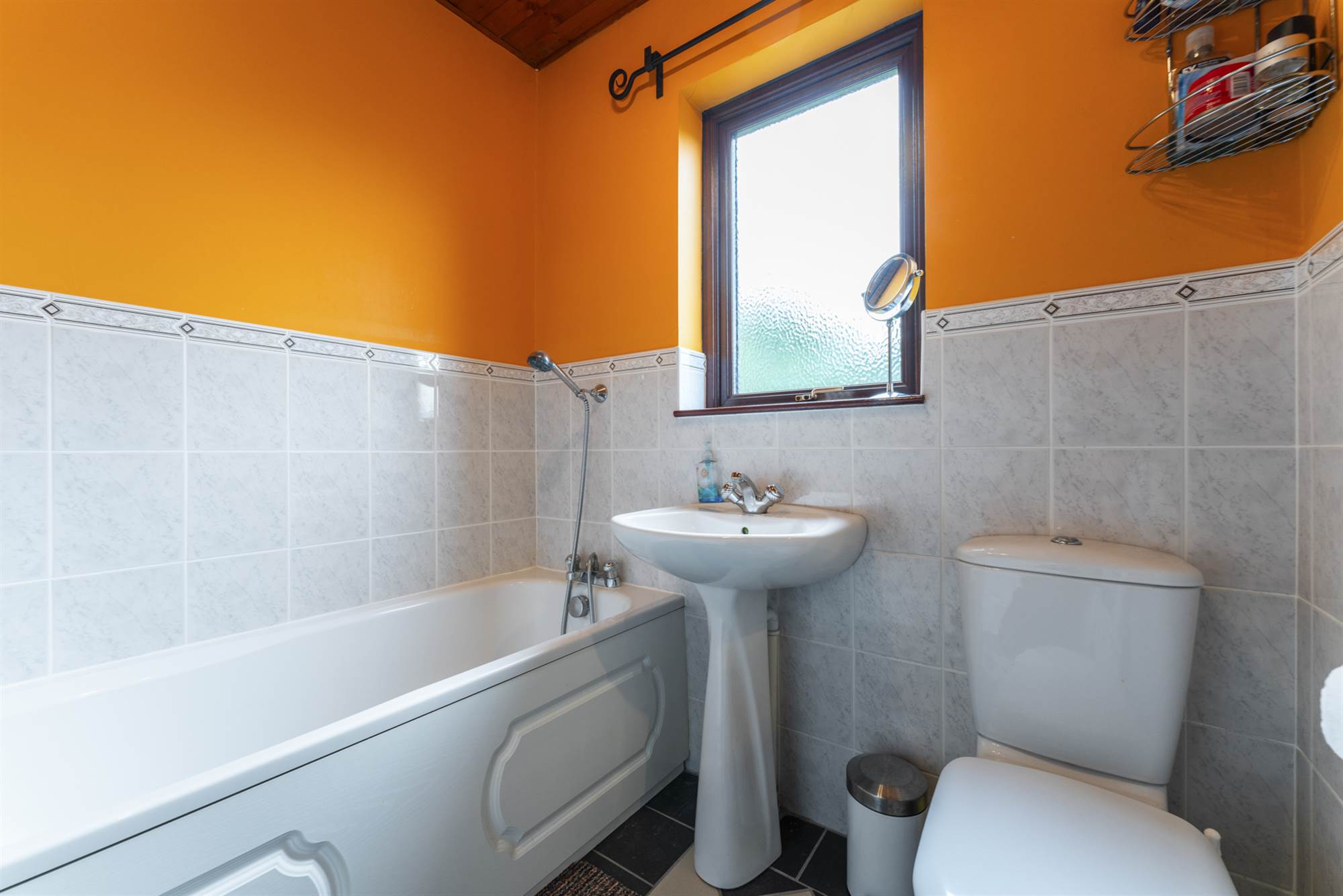 White suite, panelled bath, mixer taps, telephone hand shower, low flush WC, pedestal wash hand basin