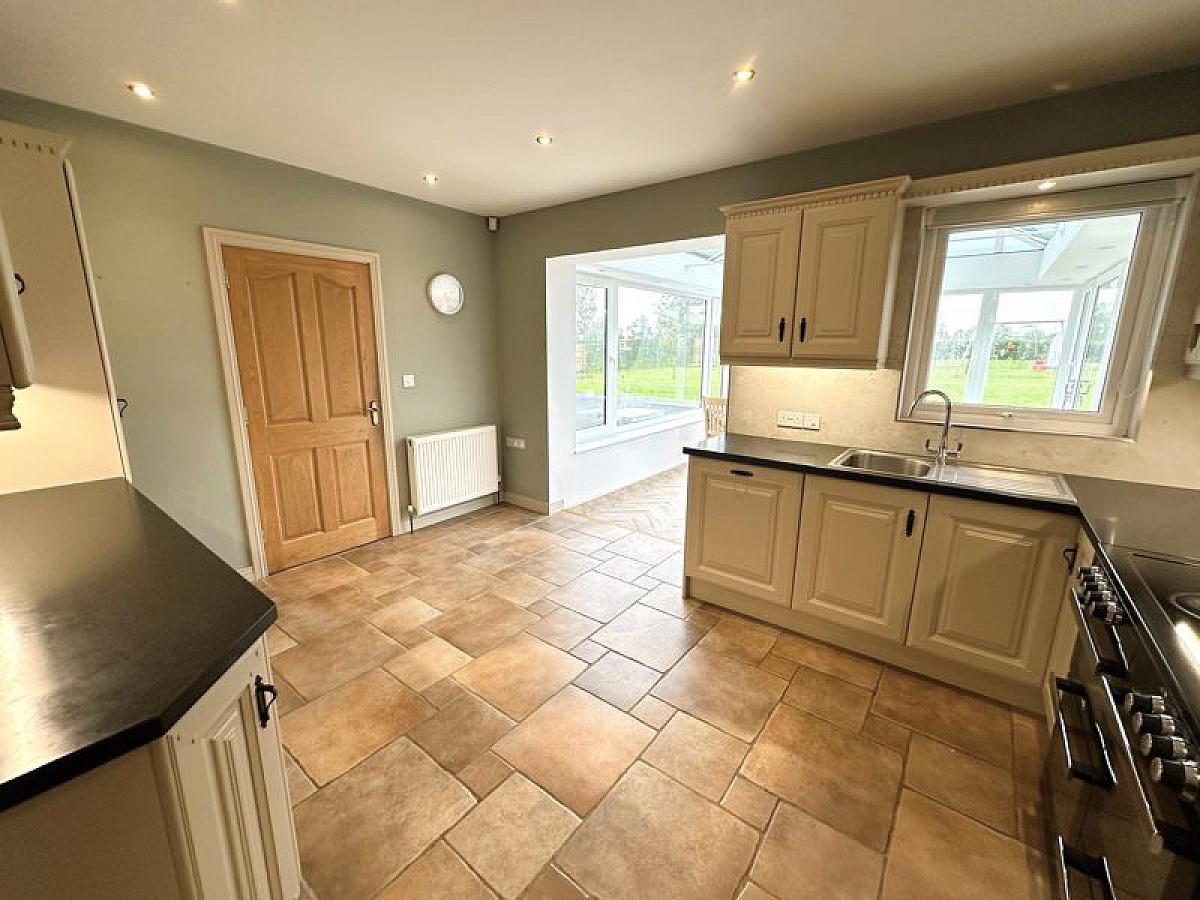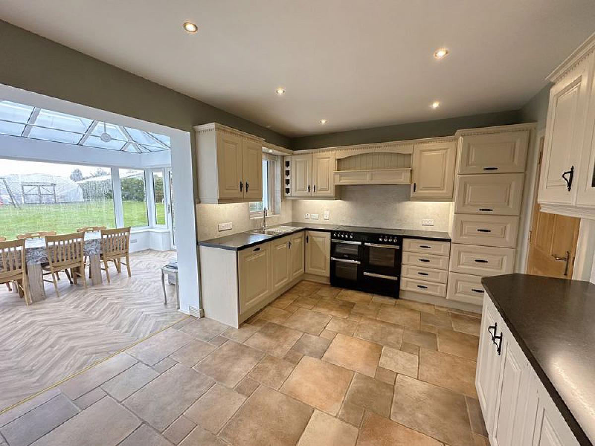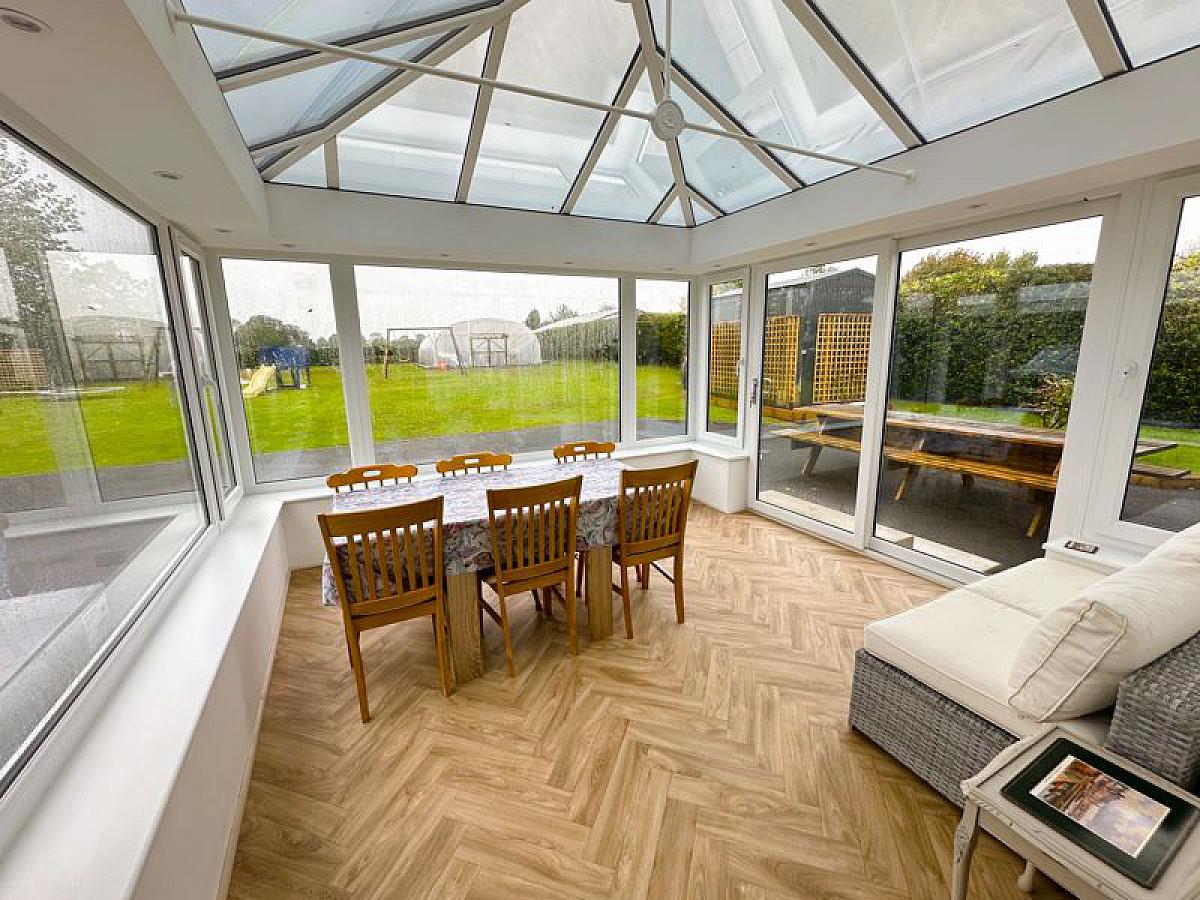 Accessed through electric entrance gates and set on a level site extending to approximately 0.7 acres, this excellent four-bedroom detached family home is beautifully presented and finished throughout. The spacious accommodation includes two bathrooms and a newly built orangery to the rear of the kitchen, designed to maximise natural light and create a seamless connection to the expansive gardens.