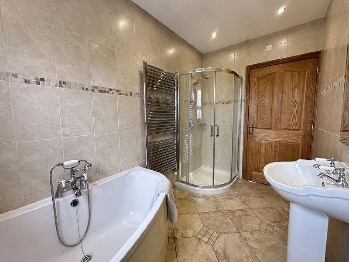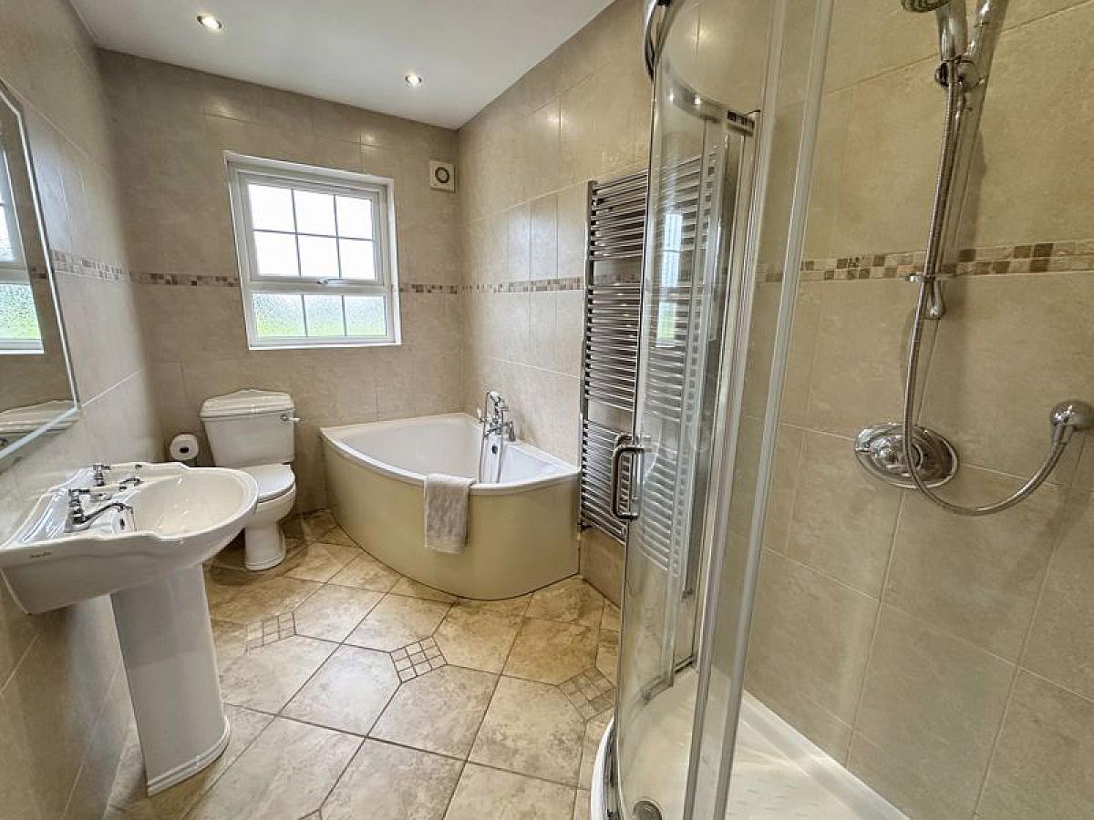 White suite comprising low flush WC, pedestal wash hand basin, offset bath with mixer tap telephone shower attachment and quadrant shower cubicle with thermostatic mixer shower, fully tiled walls and floor, recessed ceiling spots, heated chrome towel rail.
