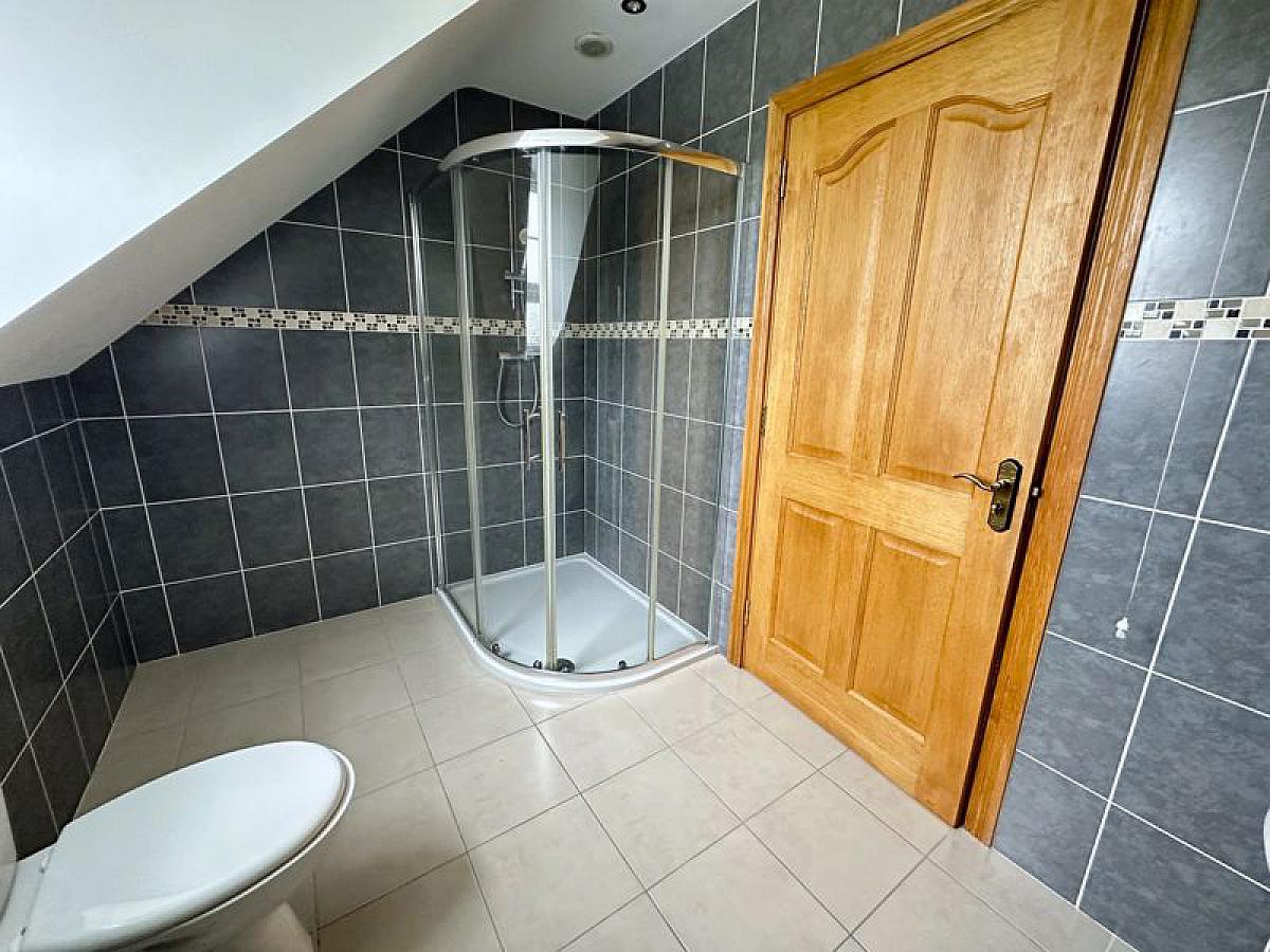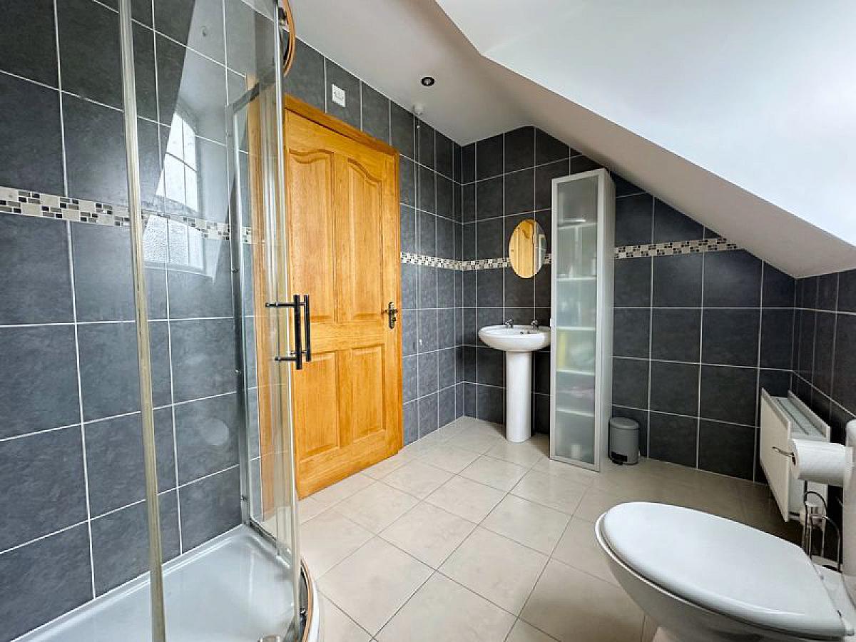 White suite comprising low flush WC, pedestal wash hand basin and quadrant shower cubicle with thermostatic mixer shower, fully tiled walls and floor, double glazed Velux rooflight, recessed ceiling spots, double radiator.