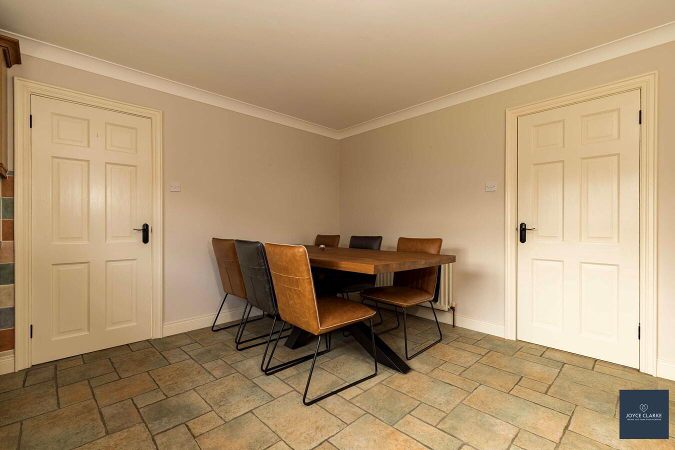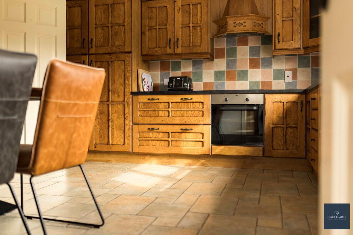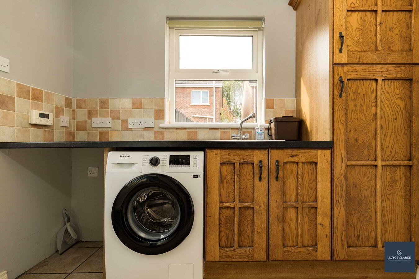 Extended solid wood kitchen units. Laminate worktop. Stainless steel sink. Space for washing machine and tumble dryer. Larder unit. Tiled splashback and flooring. Double panel radiator. Heating control unit. Oak effect UPVC rear door.