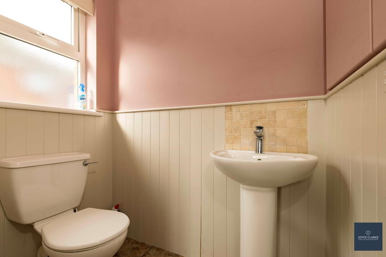 Feature wood panelling to walls. Low flush WC. Wash hand basin with pedestal. Window.