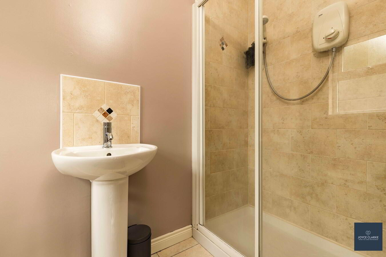 Three piece suite consisting of, walk in shower cubicle with Mira electric unit. Wash hand basin and pedestal. Low flush WC. Single panel radiator. Window. Tiled splashback and shower enclosure.