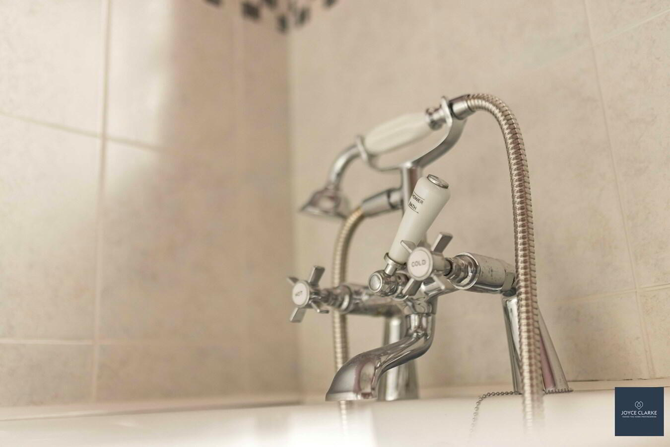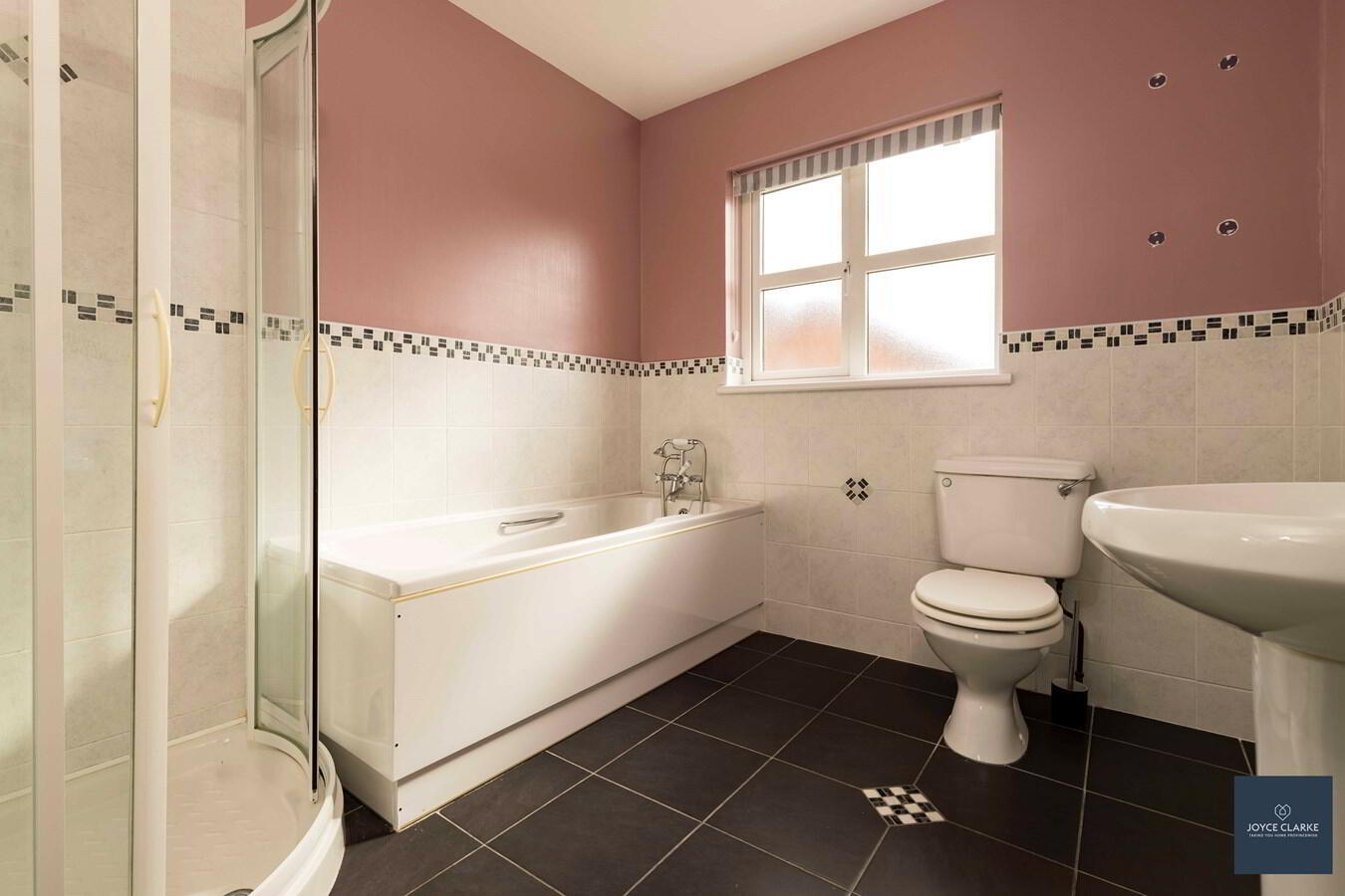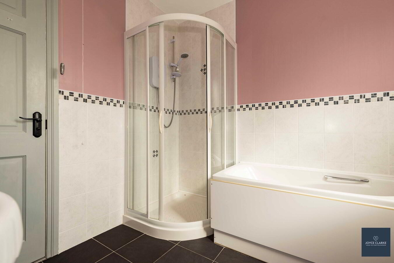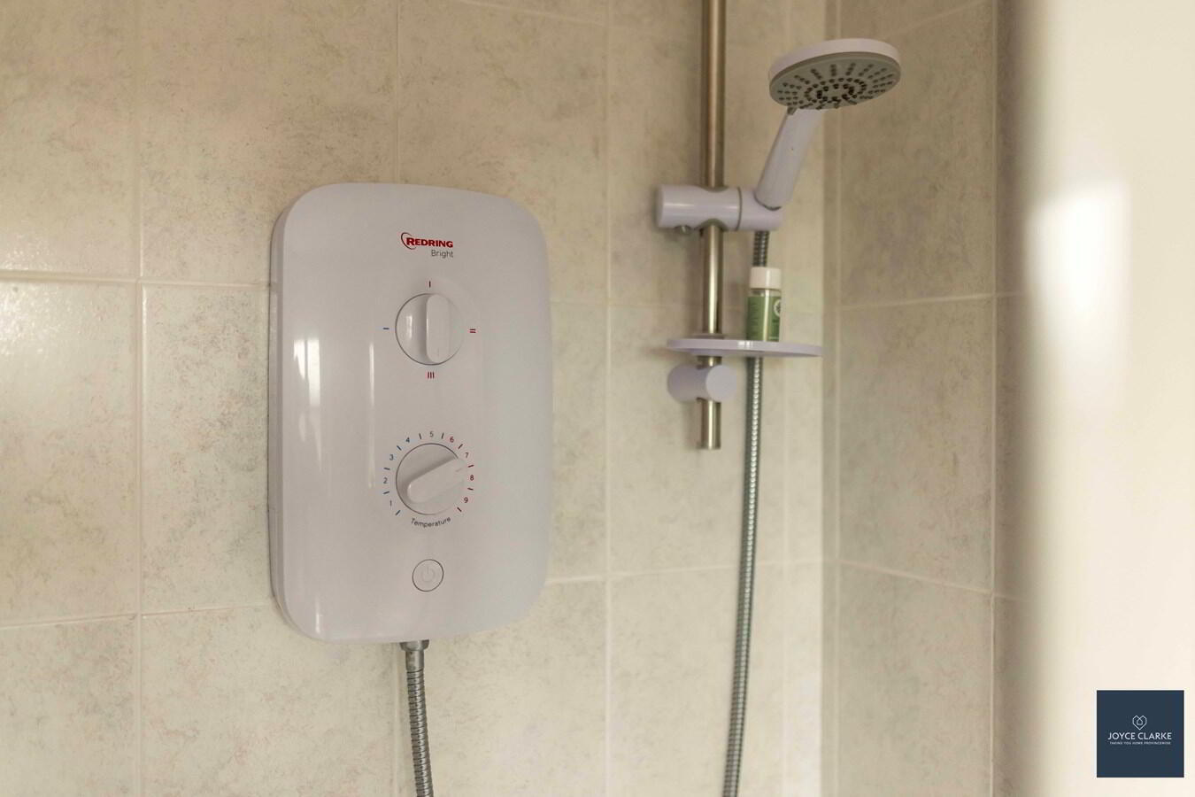 Four piece bathroom suite comprising of, walk in shower cubicle with RedRing electric unit. Panel bath with telephone attachment. Low flush WC. Wash hand basin with pedestal. Tiled floor. Half tiled wall and shower enclosure. Window. Extractor fan. Double panel radiator.