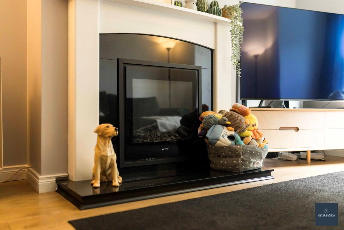 Bay Window. Feature fireplace with electric fire and tiled hearth. Double panel radiator. Laminate flooring.