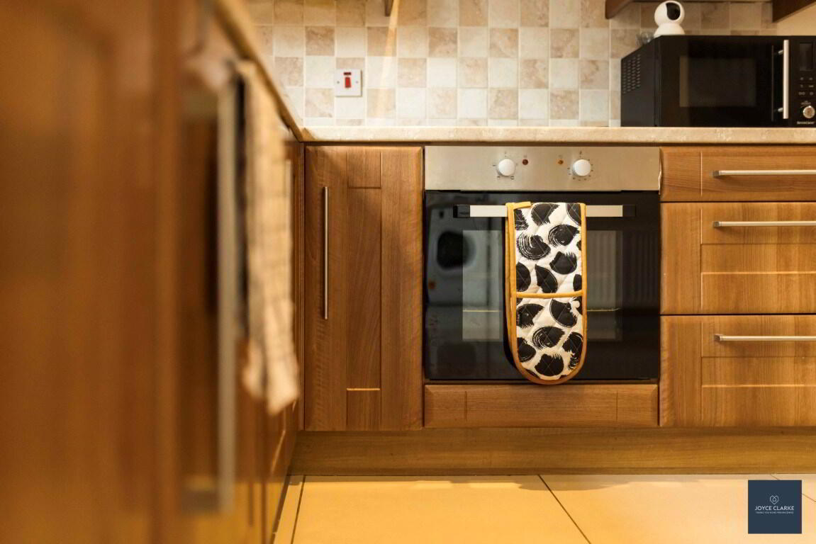 Excellent range of high and low-level units, including glazed display cabinet. Range of integrated kitchen appliances, including oven and four ring hob with stainless steel extractor hood over, dishwasher and fridge- freezer. One and a half bowl stainless steel sink. Tiled flooring. Recessed lighting.
