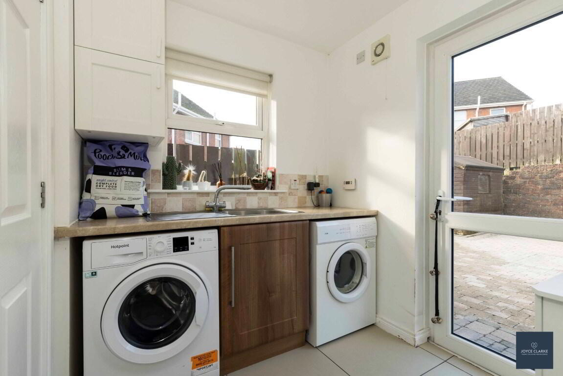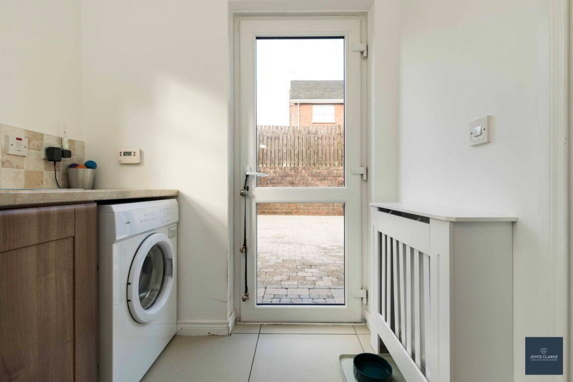 Low level units with space for washing machine and tumble drier. Stainless steel sink and drainer. Tiled flooring and splashback. Partially glazed door to rear. Double panel radiator.