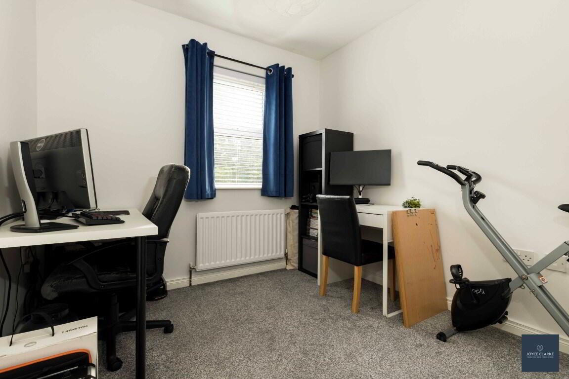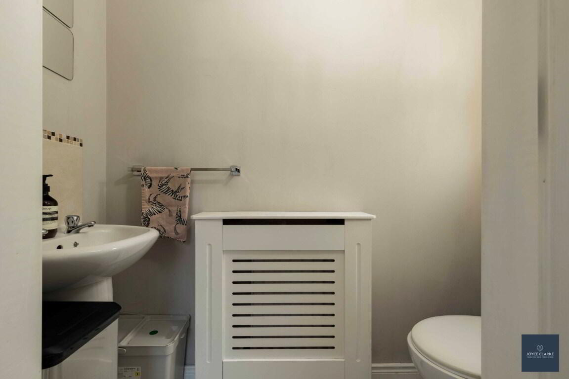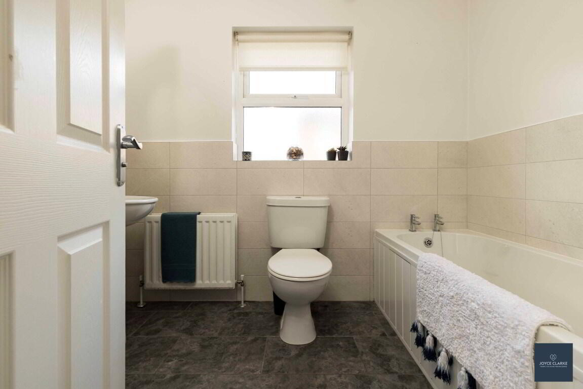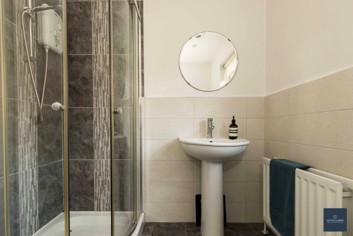 Excellent four-piece bathroom suite comprising of corner shower cubicle, pedestal style sink, bath and dual flush WC. Window. Extractor fan. Partially tiled walls. Double panel radiator.