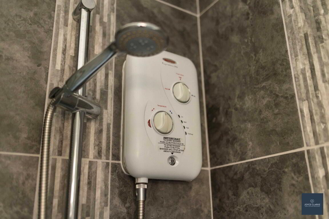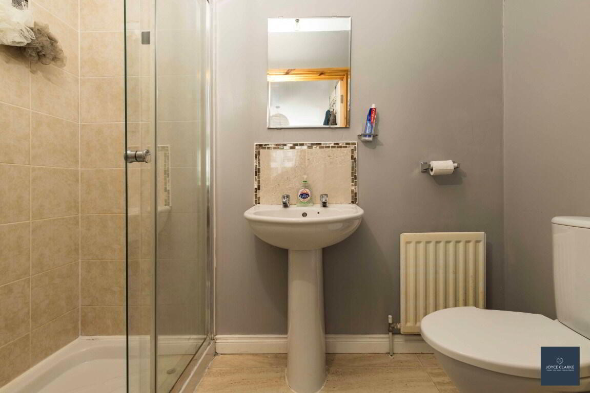 Walk-in shower enclosure with electric shower, pedestal style sink and dual flush WC. Single panel radiator. Extractor fan.
