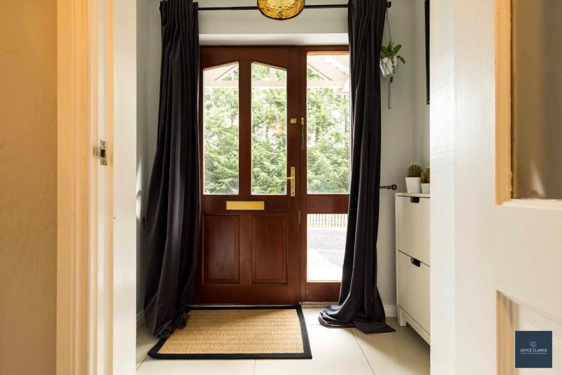 Partially glazed hardwood door with glazed side panels, leading into porch. Tiled flooring.