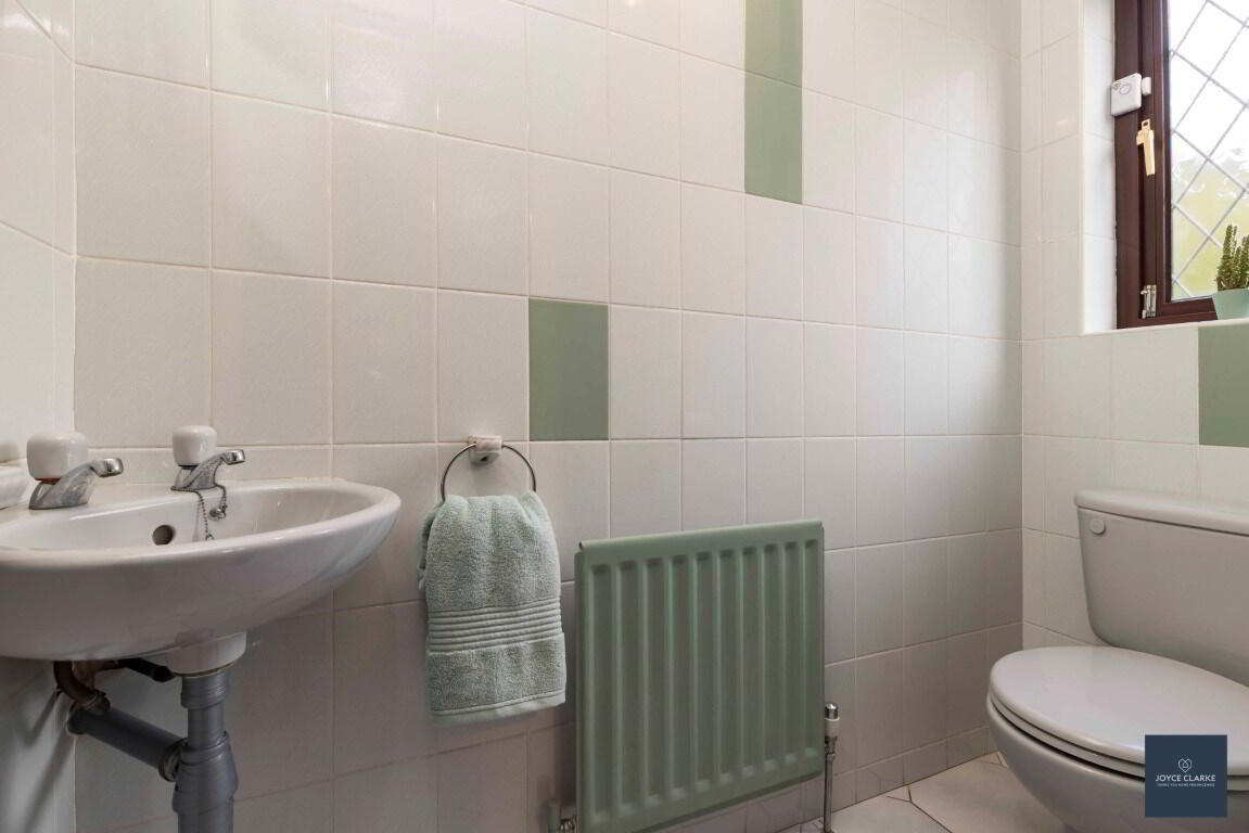 Close coupled WC and wall mounted wash hand basin. Heated towel rail. Tiled flooring and partial wall tiling.