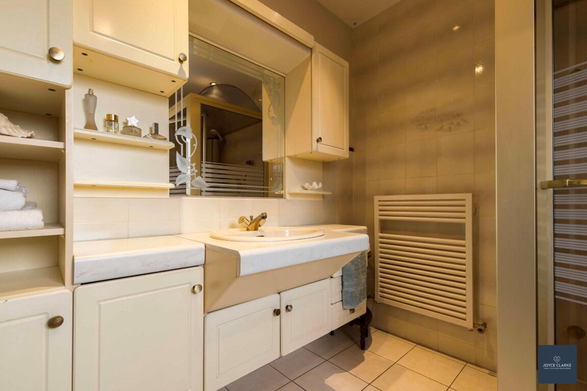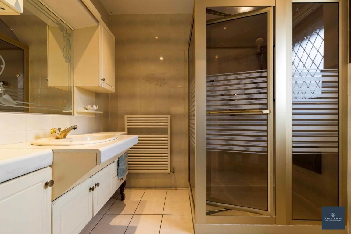 Large shower enclosure with mains fed shower and steam shower. Close coupled WC and wash hand basin with fitted vanity storage. Heated towel rail. Recessed lighting. Tiled flooring and selected wall tiling.