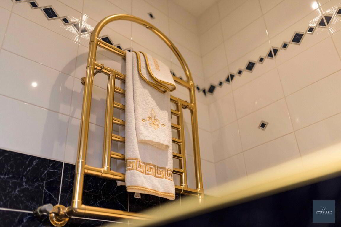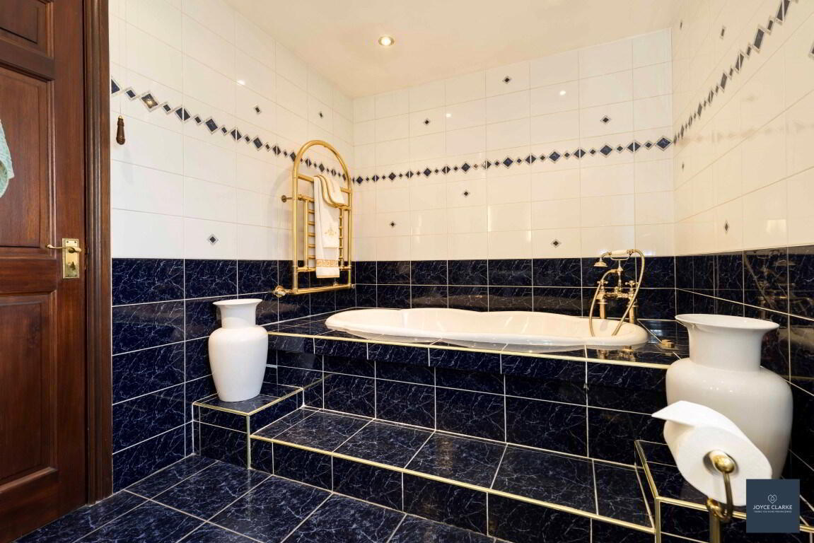Fully tiled family bathroom comprising Jacuzzi bath with jets and telephone style mixer tap with shower head attachment. Separate shower enclosure with mains fed shower and pivot door. Close coupled WC and wash hand basin with pedestal. Heated towel rail. Fully tiled walls and flooring. Recessed lighting.