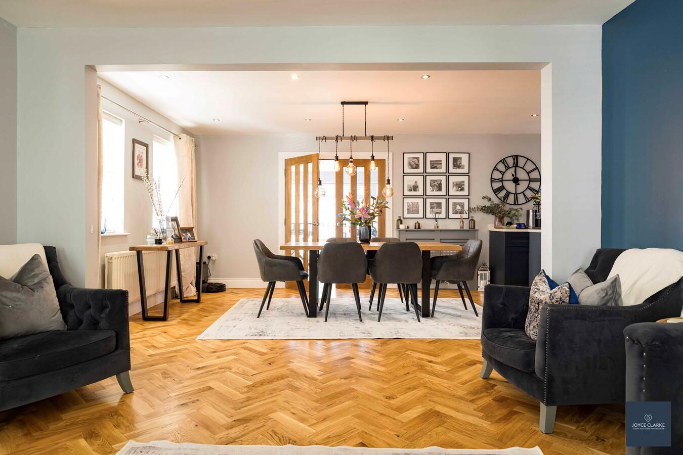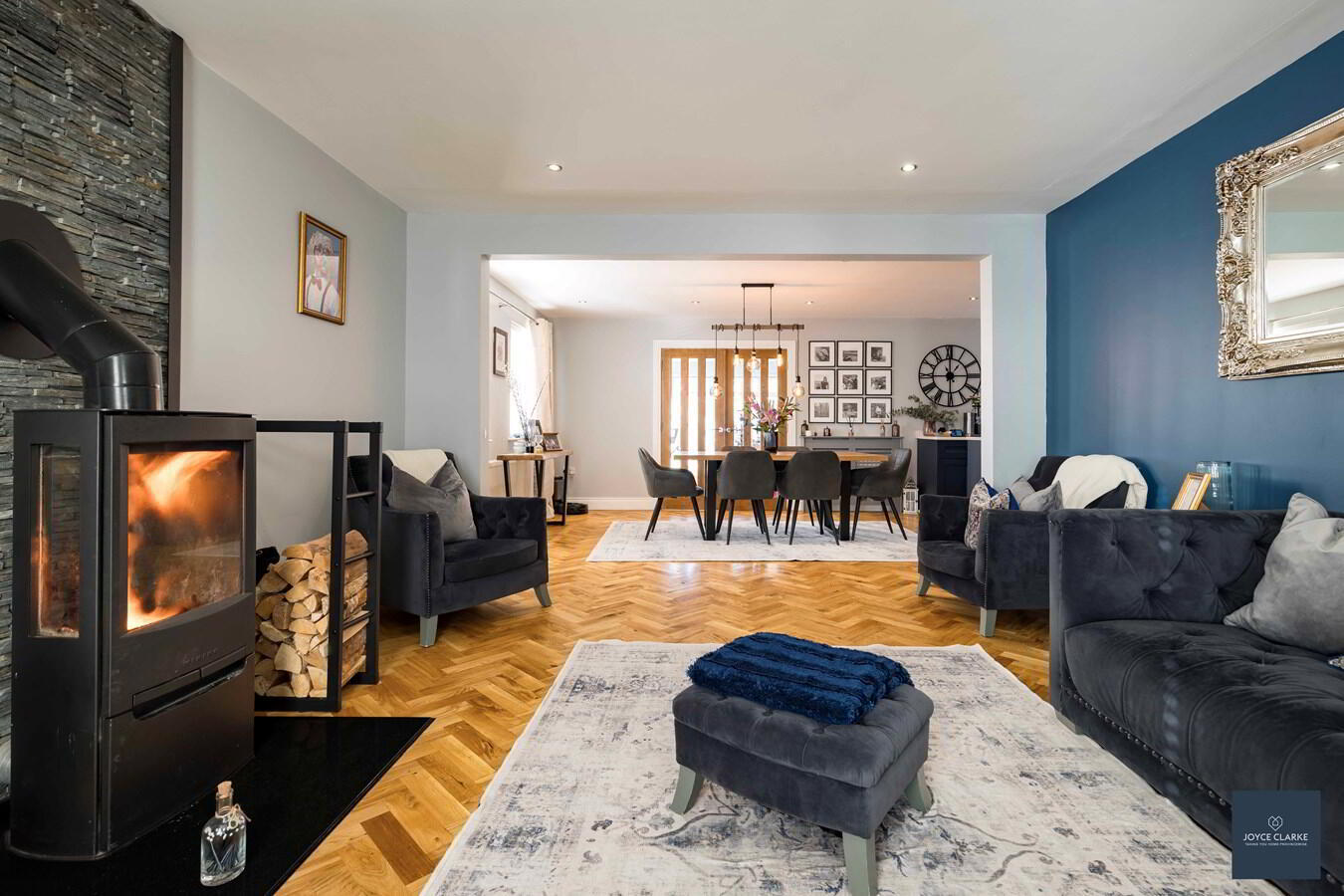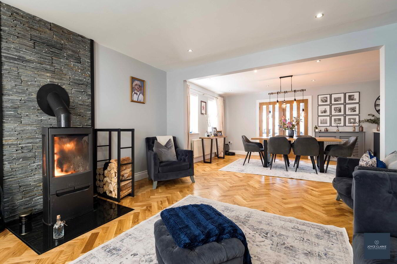 Open plan to kitchen dining. Free standing multi-fuel stove with feature slate wall to rear. Herringbone wooden flooring. Recessed lighting. Double panel radiator.