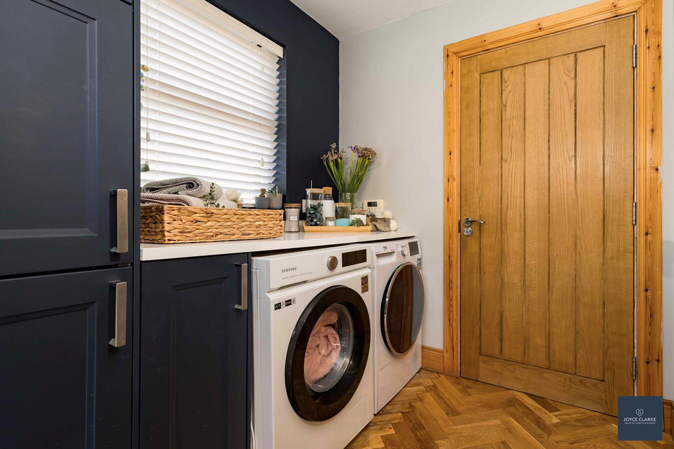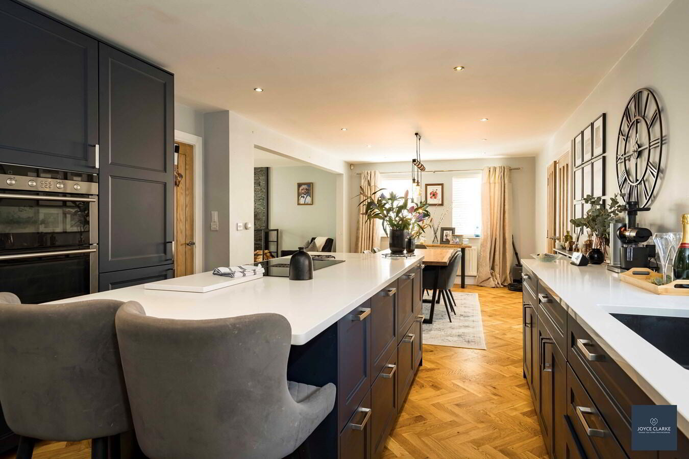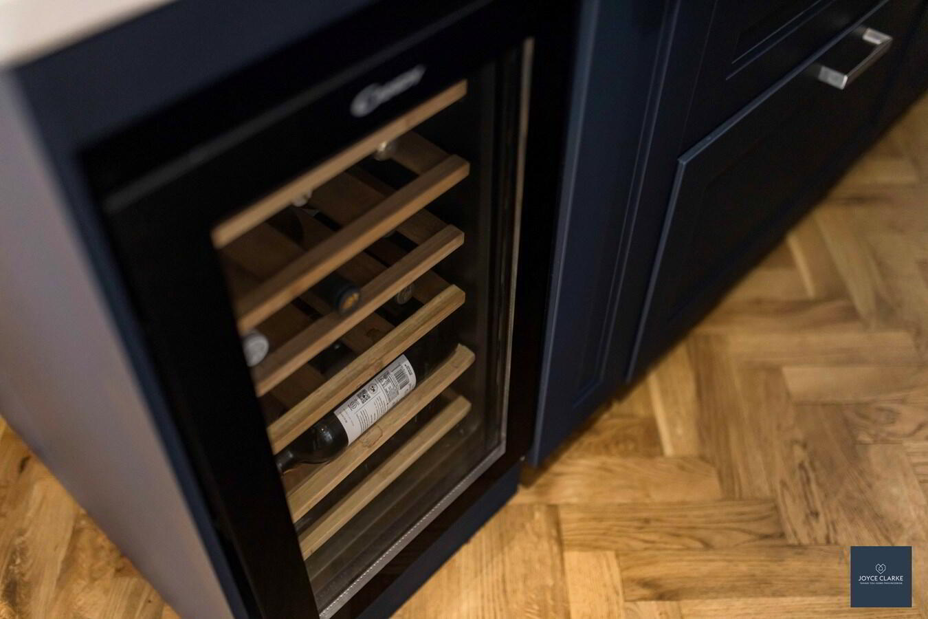 Recently fitted navy kitchen with superb range of storage units complimented by an array of integrated appliances to include Siemens eye level oven and grill, dishwasher, induction hob, microwave and wine cooler Space for American style fridge freezer. Granite work surfaces. Co-ordinated island with storage and seating area. Herringbone flooring.