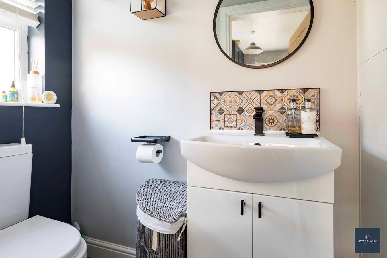 Dual flush WC. Pedestal wash hand basin. Single panel radiator. Tiled flooring. Window.