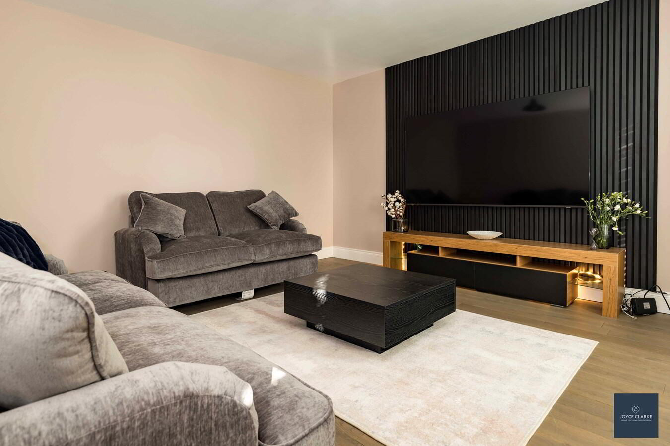 Front aspect lounge with feature acoustic wood wall panelling. Double panel radiator.