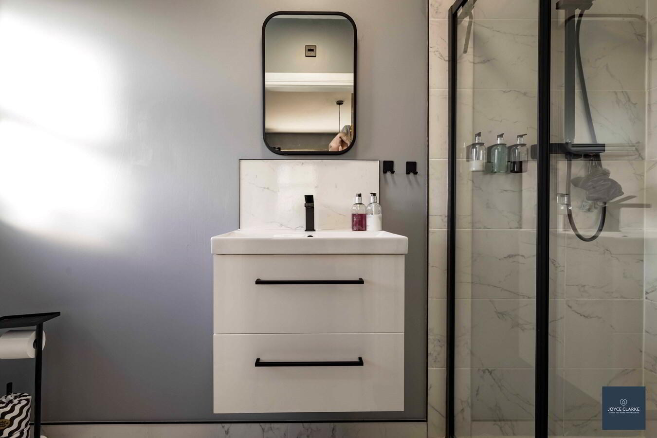 Fully tiled, three piece bathroom suite comprising of walk-in shower cubicle, floating sink and dual flush WC. Single panel