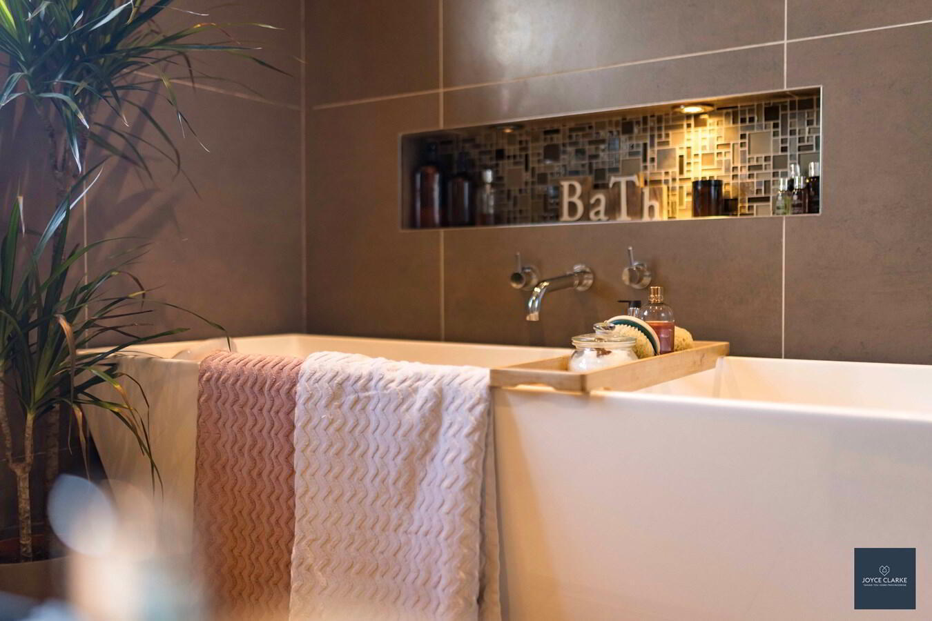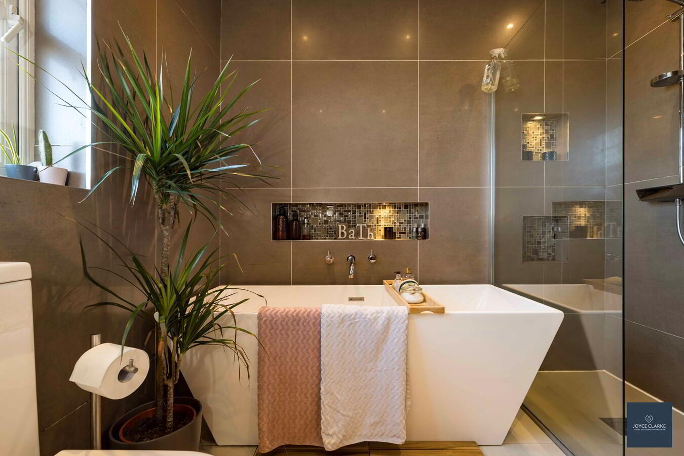 'SOAKS' four piece luxury bathroom suite consisting of a free standing bath, dual Öush WC, walk-in shower with waterfall shower head, floating wash hand basin with vanity unit below. Heated towel rail. Mirror with LED lighting. Fully tiled. Recessed lighting. UPVC cladded ceiling.