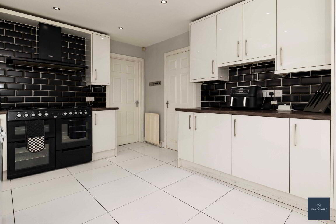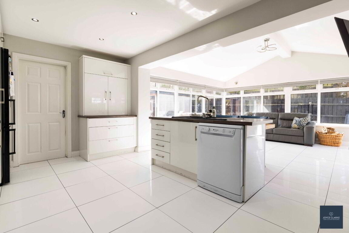 Extensive range of high and low level white high gloss cabinets. Range of appliances to include Beko electric oven with six ring gas hob. Extractor fan canopy above. Integrated freezer. Samsung fridge freezer. Island with integrated dishwasher underneath. One and a half bowl sink and draining unit. Power points. Two single panel radiators.