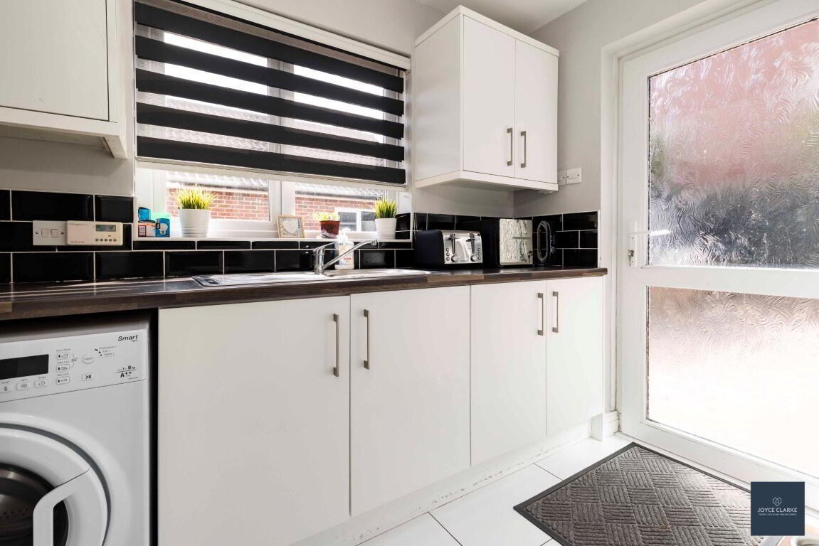 Range of high and low cabinets. Tiled flooring. Stainless steel sink and drainer unit. Space for washing machine. Power points. Double panel radiator. UPVC rear door with frosted glazed panels giving access to rear. Heating control panel.