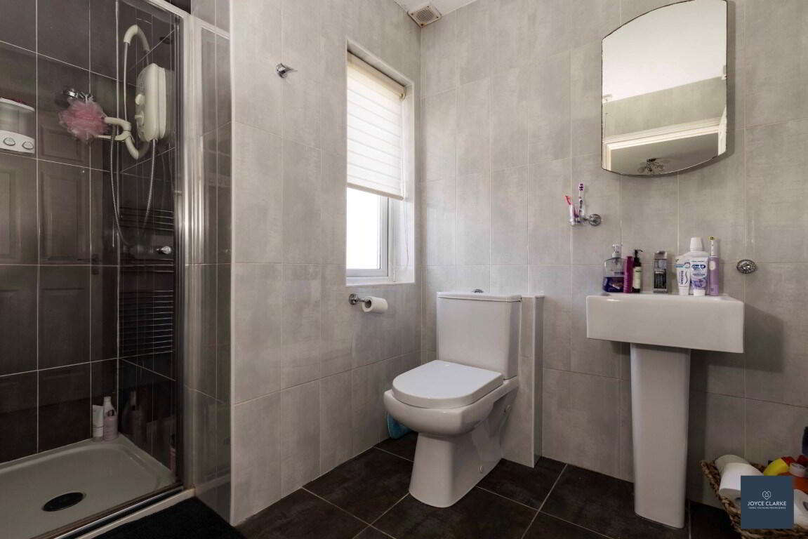 Three piece suite comprising of tiled shower enclosure with Mira Sport electric shower. Dual flush WC. Wash hand basin with pedestal. Heated towel rail.