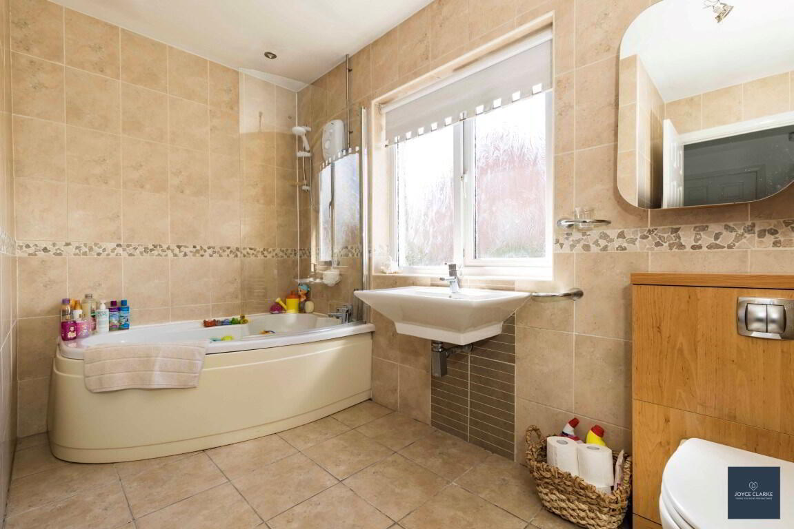 Fully tiled family bathroom. Three piece suite consisting of corner bath with Triton electric shower above. Dual flush WC. Floating wash hand basin. Heated towel rail.