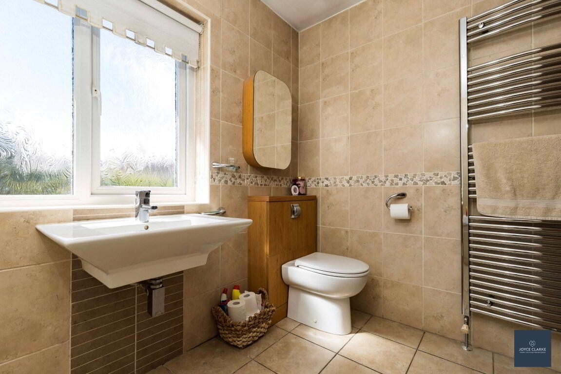 Dual flush WC. Floating sink. Heated towel rail. Tiled floor. Window.