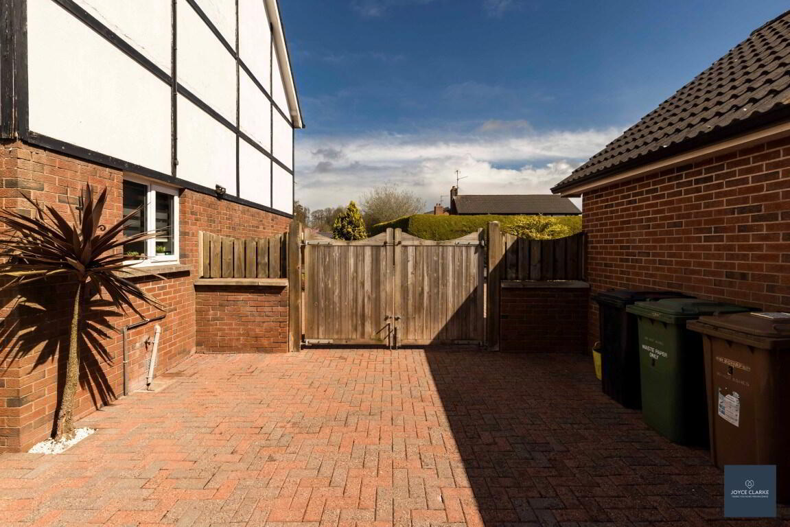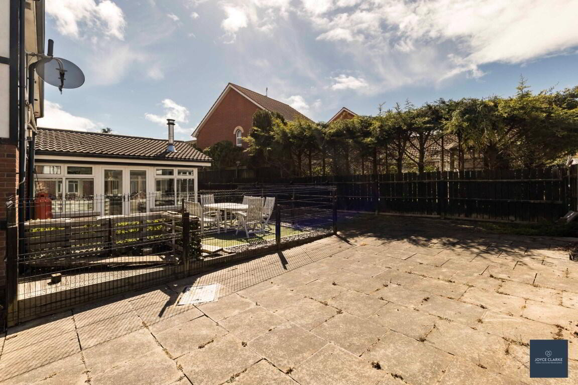 Fully enclosed spacious rear garden . Raised flower beds with mature shrubs. Oil tank. Outside tap. Paved patio area with roller awning above. Double timber gate. Pedestrian gate with access to side. Paved driveway.