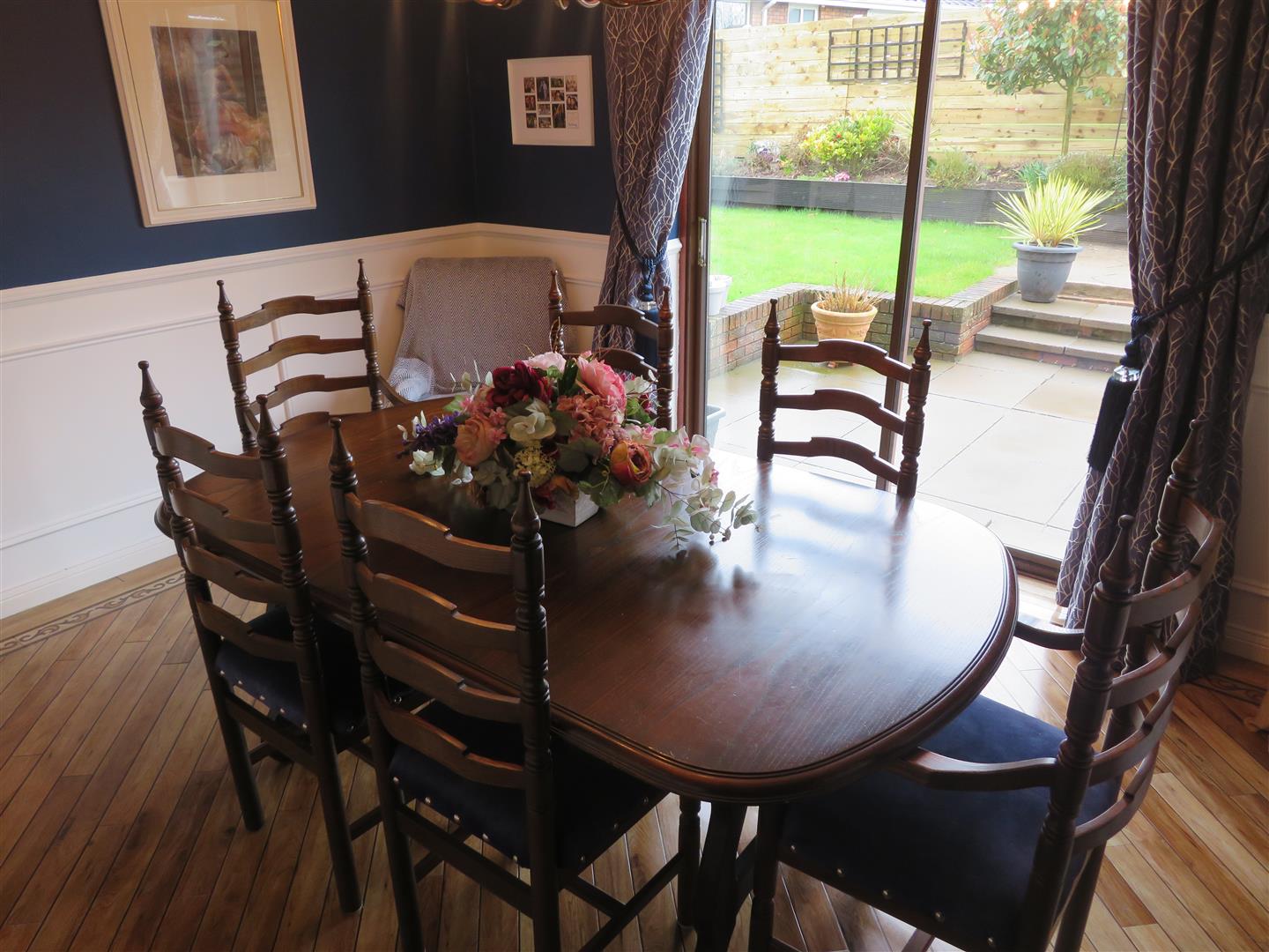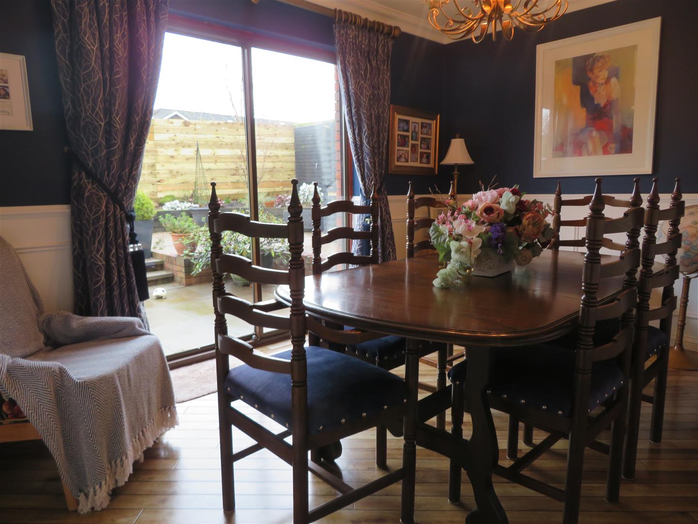 Rear aspect formal dining room with Amtico flooring, feature half panelled walls, sliding patio door to rear and cornicing.