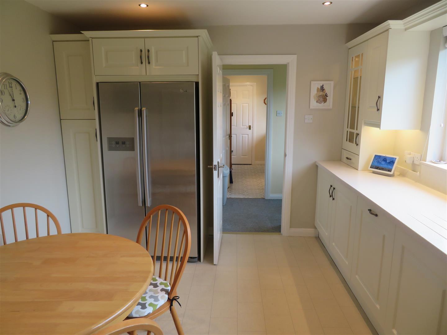Modern kitchen with great range of high and low level fitted units, space for free standing American style fridge freezer, space for range cooker with extractor hood above and tiled splash back, integrated dishwasher, stainless steel sink unit with mixer tap and lighted pelmet above, recessed lights, vinyl flooring. Through to rear hall with back door and access to integral garage.