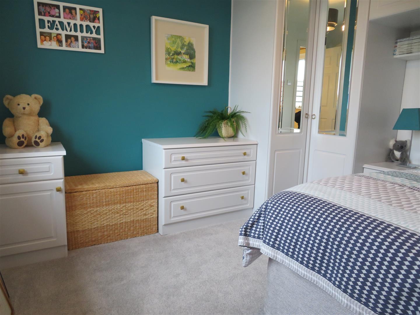 Side aspect double bedroom with range of fitted wardrobes and drawers, carpet flooring.
