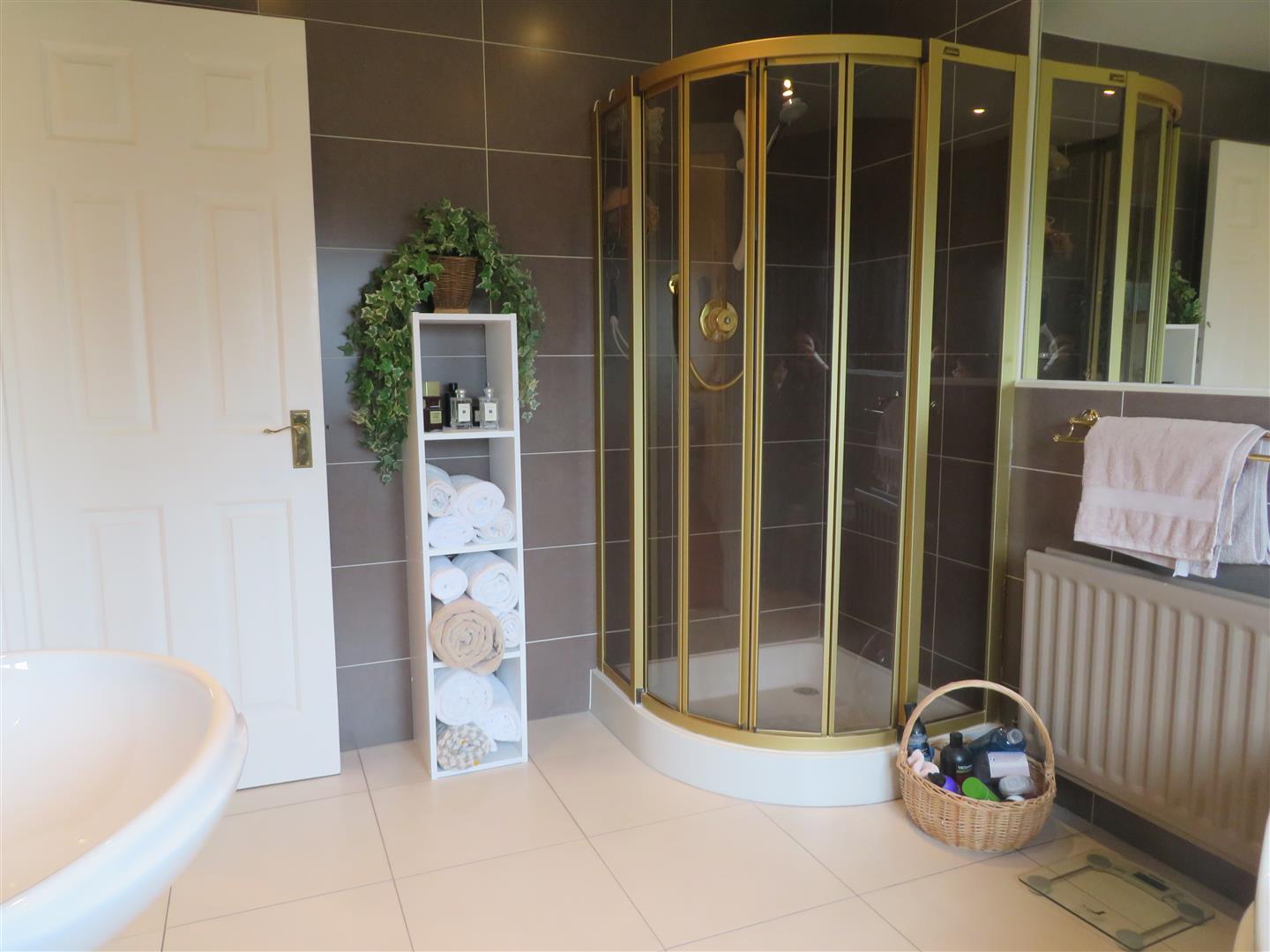 Spacious bathroom comprising large corner panel bath, pedestal wash hand basin, mains powered shower in corner cabinet and WC. Fully tiled walls and floor, recessed lights.