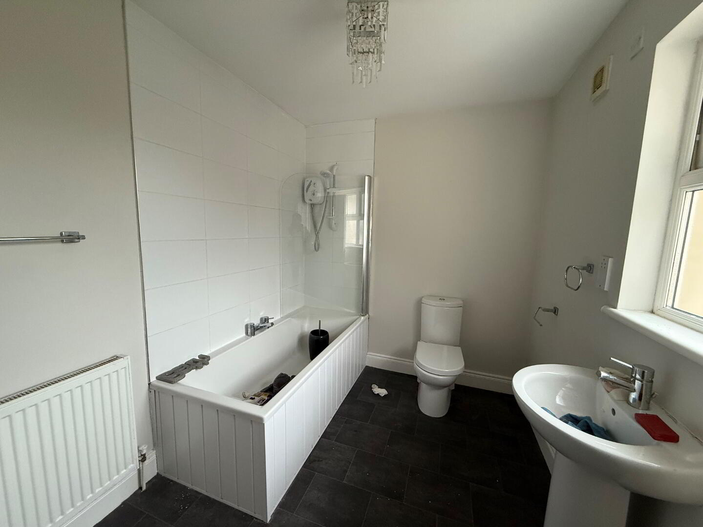 2.73m x 02.14m (8' 11" x 7' 0") 3 piece white suite comprising pedestal wash hand basin, low flush w/c, panel bath tub with shower screen, Triton electric shower unit over, partly tiled walls, extractor fan, radiator, vinyl flooring.