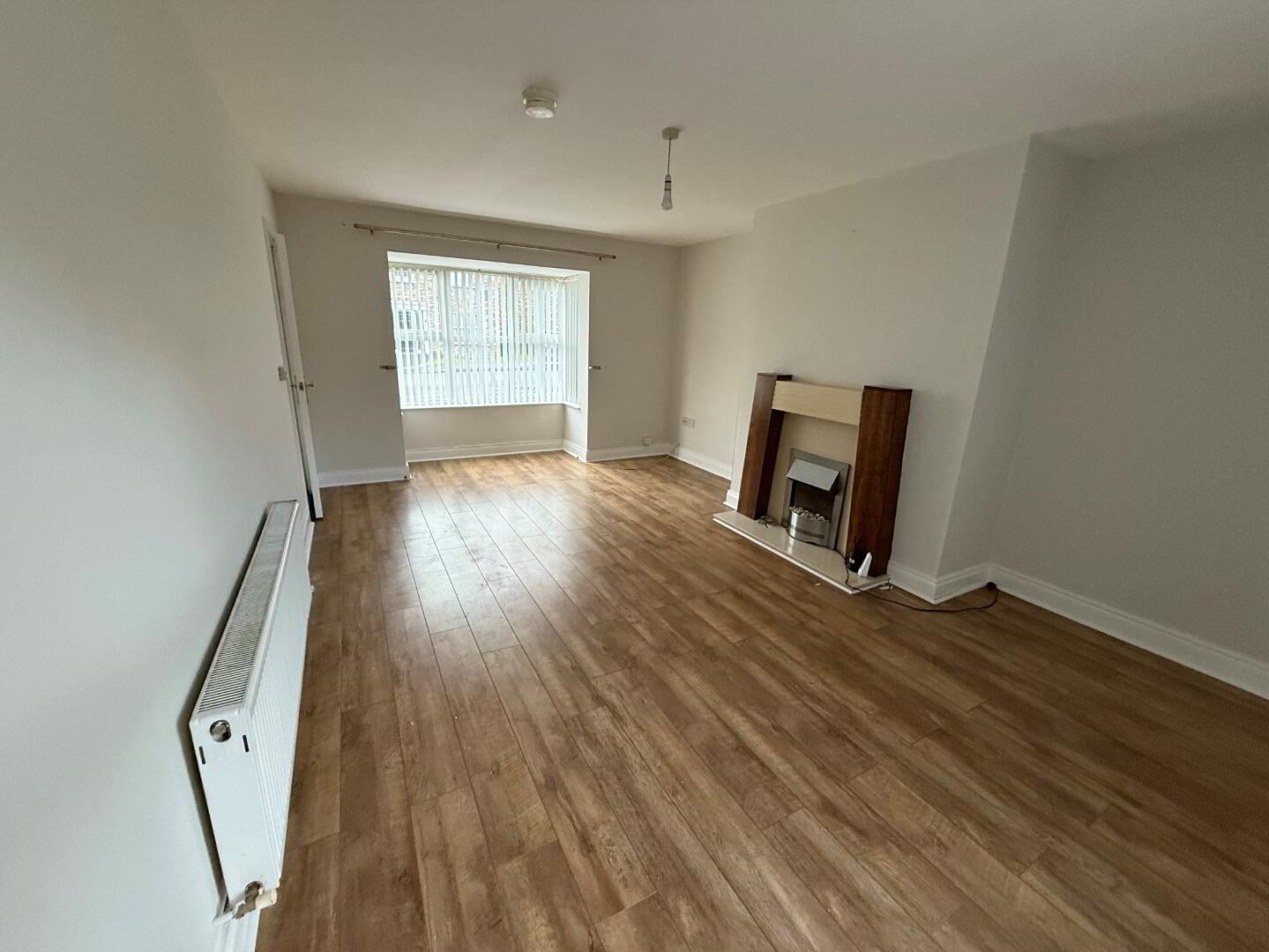 05.65m x 3.87m (18' 6" x 12' 8") Wood laminate flooring, open fire in wood surround with marble inset and hearth, currently housing an electric fire, bay window, radiator.