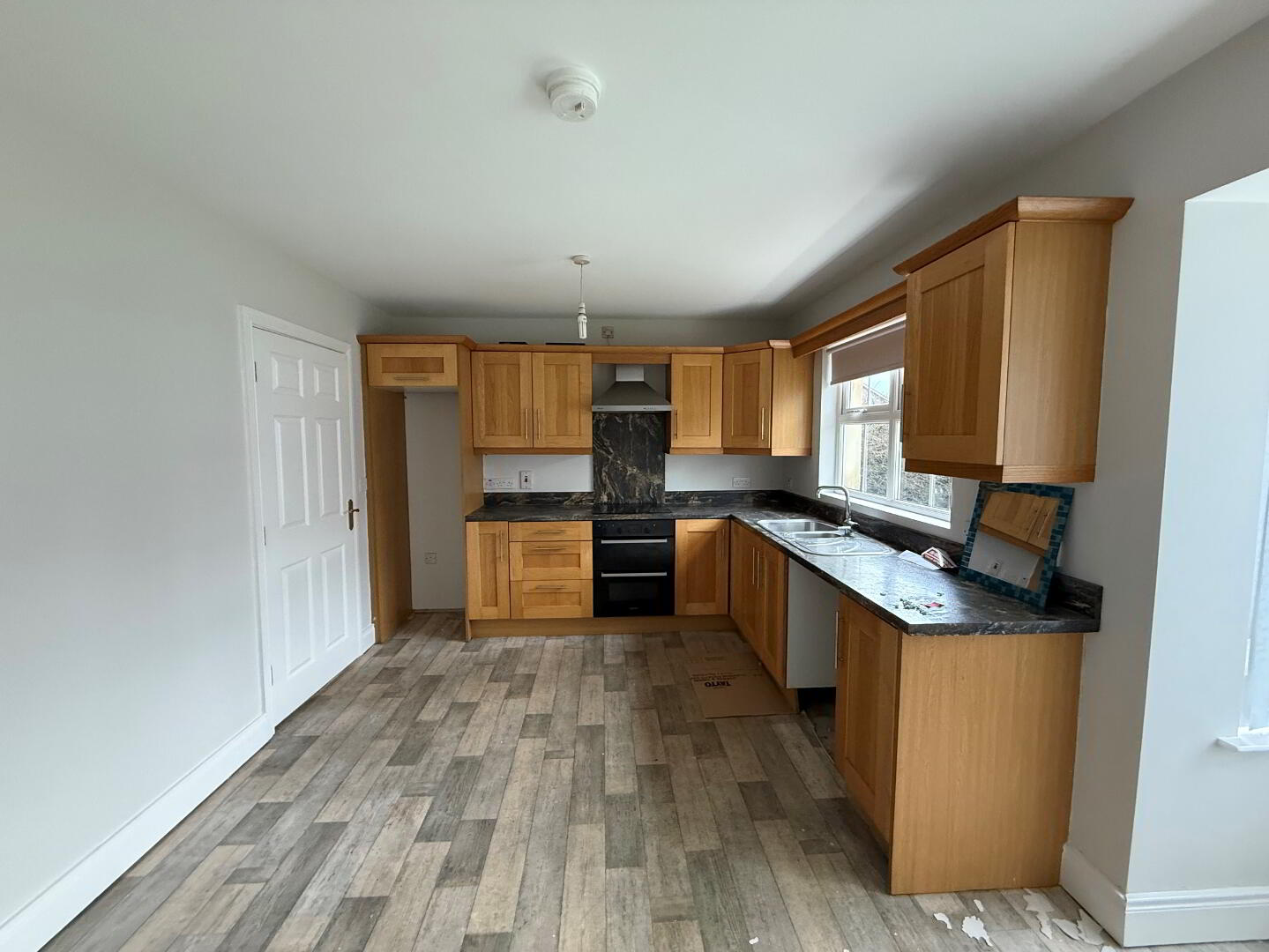 5.10m x 4.00m (16' 9" x 13' 1") Fitted kitchen with range of high and low level units, 1 and half stainless steel sink with mixer tap, space for dishwasher and fridge/freezer, built-in electric oven, 4 ring induction hob, stainless steel extractor fan over, vinyl flooring, bay window to dining area, radiator.