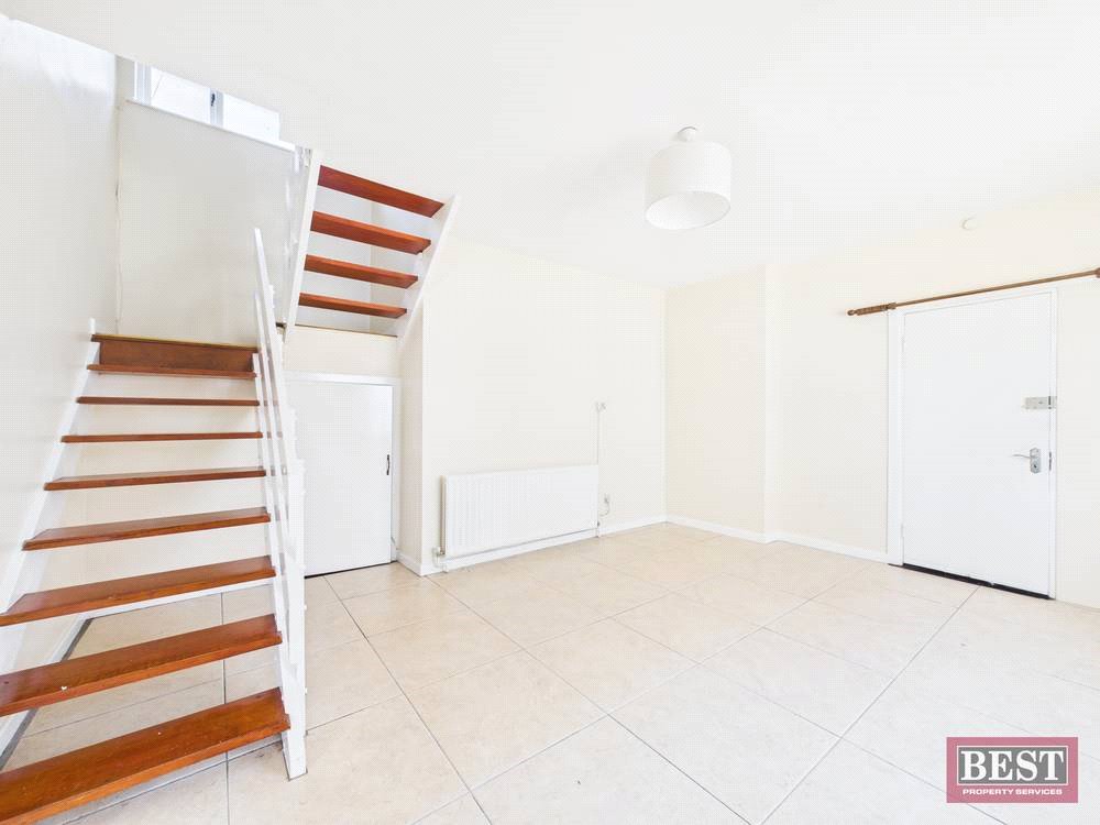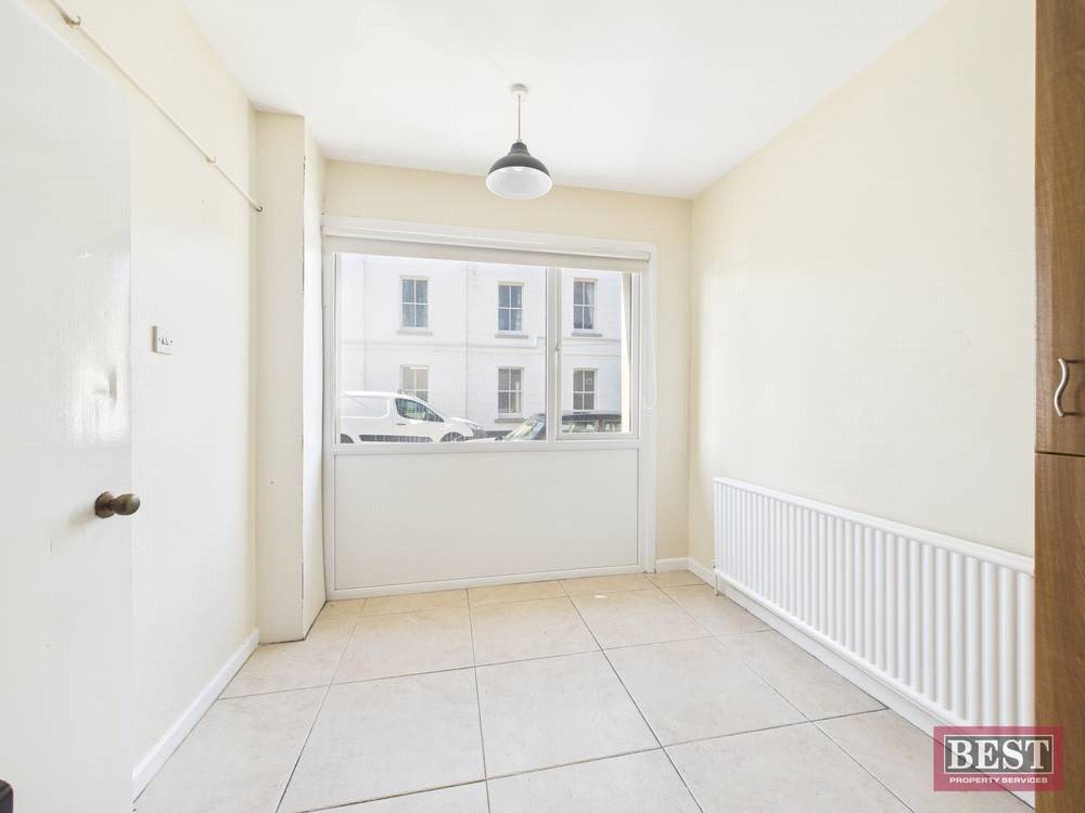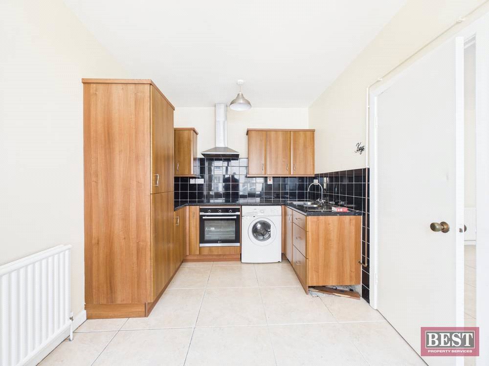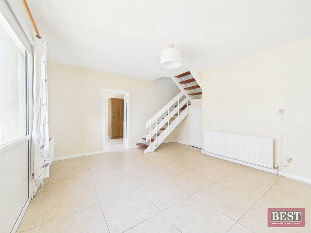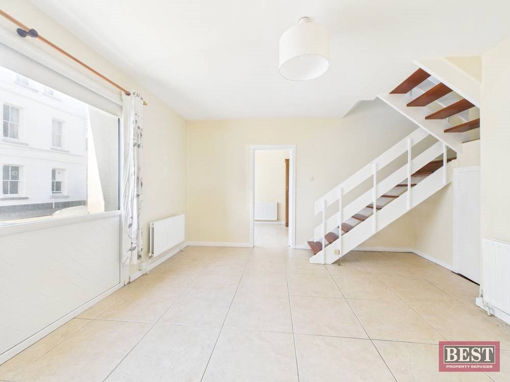 Upon entering, you are greeted by a spacious living room with a large front window that allows plenty of natural light, along with convenient under stair storage. The room leads into a kitchen and dining area, equipped with a full range of upper and lower kitchen units, appliances, and space for a dining table.